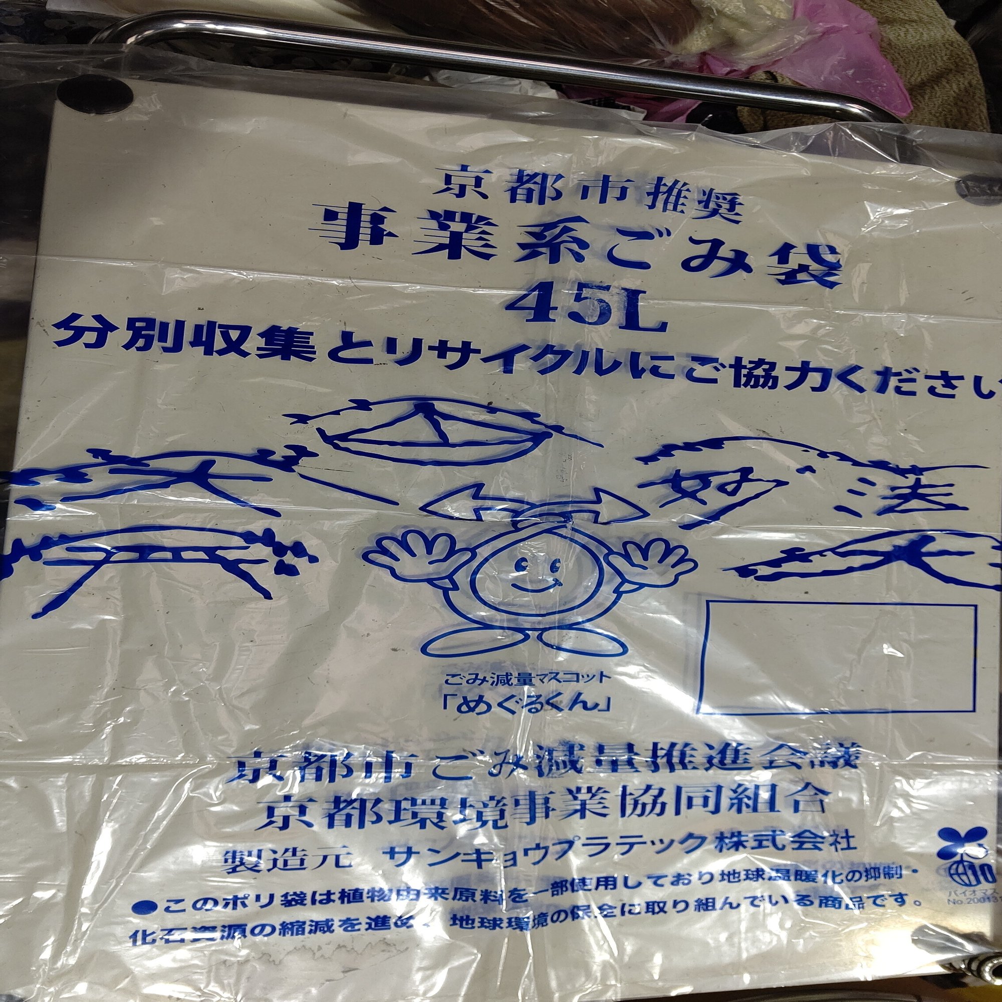 こちらは京都府京都市の事業系ごみ袋。ごみ減量マスコットの『めぐるくん』と大文字焼がプリントされている