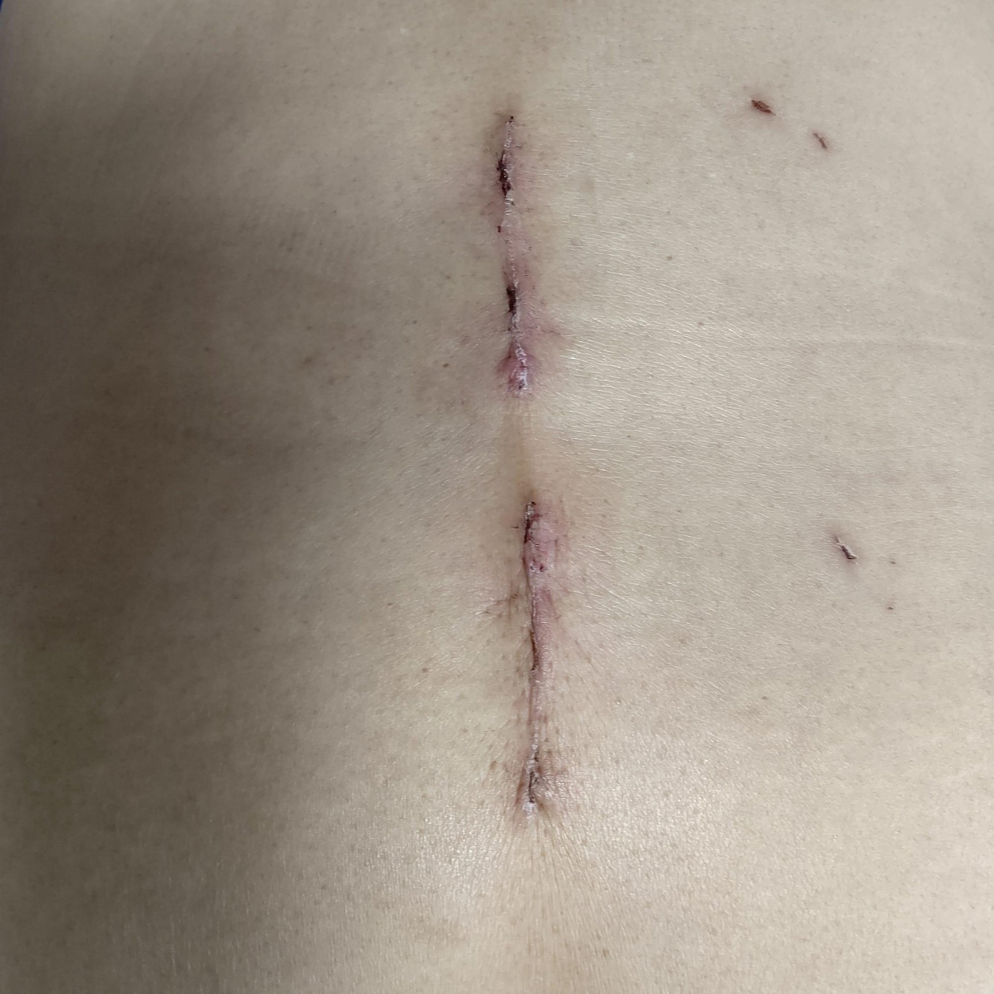 術式は腰椎椎弓形成術+後方ヘルニア摘出術で、切開部が2か所だったために4時間もかかりましたが無事終了。椎間板を摘出したのと同時に骨に突起が有ったので、それも削ったとの事でした。