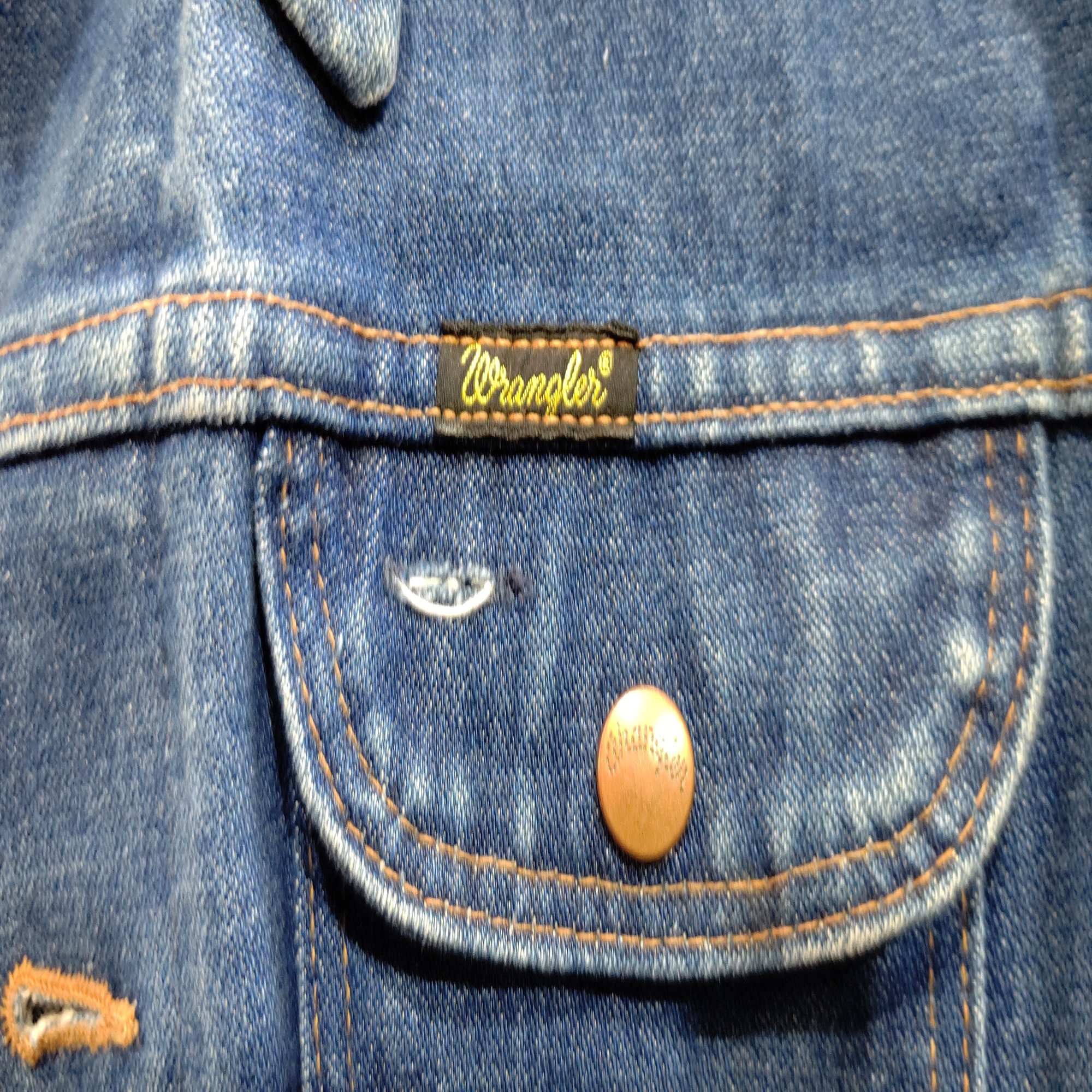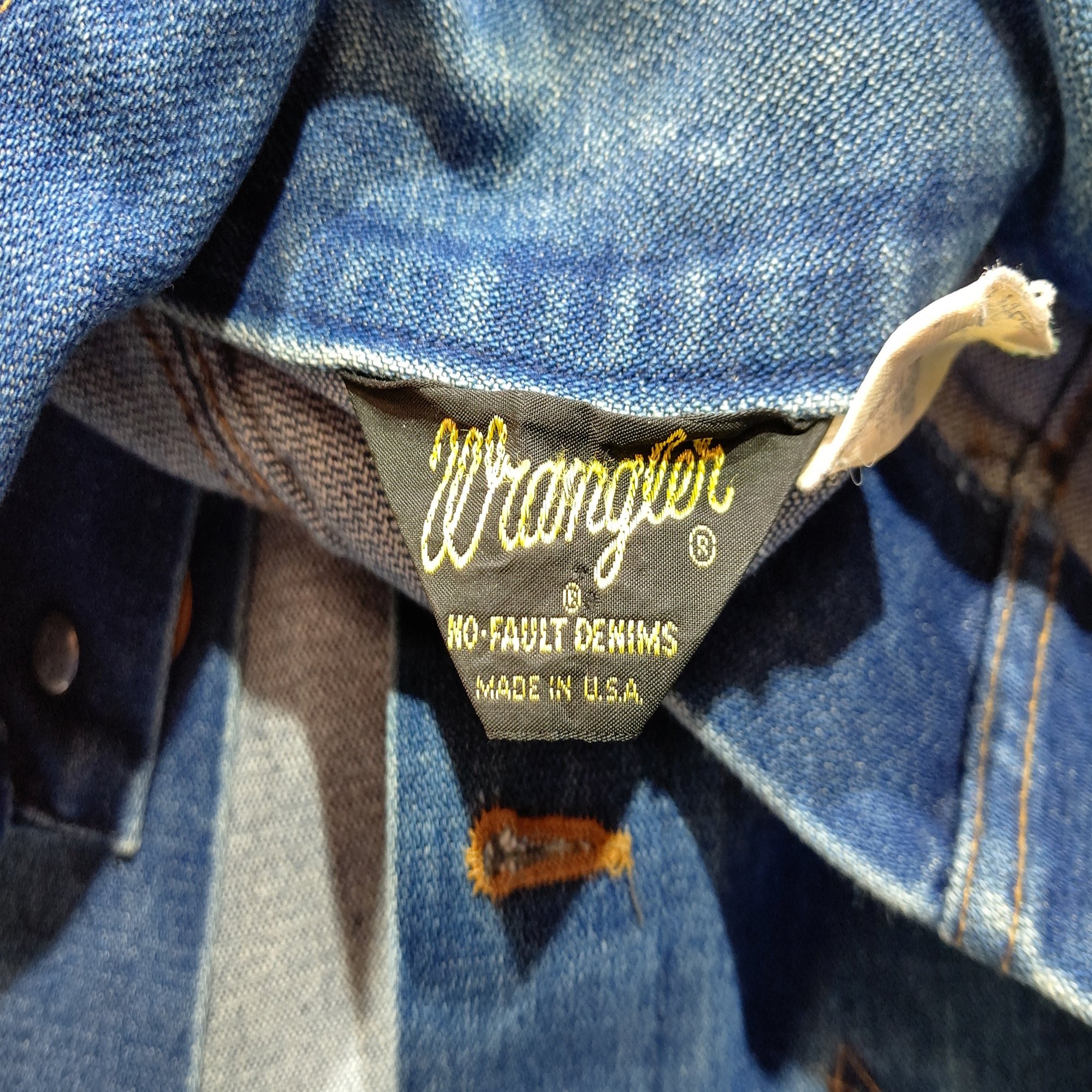 80年代初期のWARNGLERのタグの特徴と一致、「Wrangler」と「MEDE IN U.S.A」の表記の間に「NO FAULT DENIMS」が追加。40年ほど前のビンテージ。
