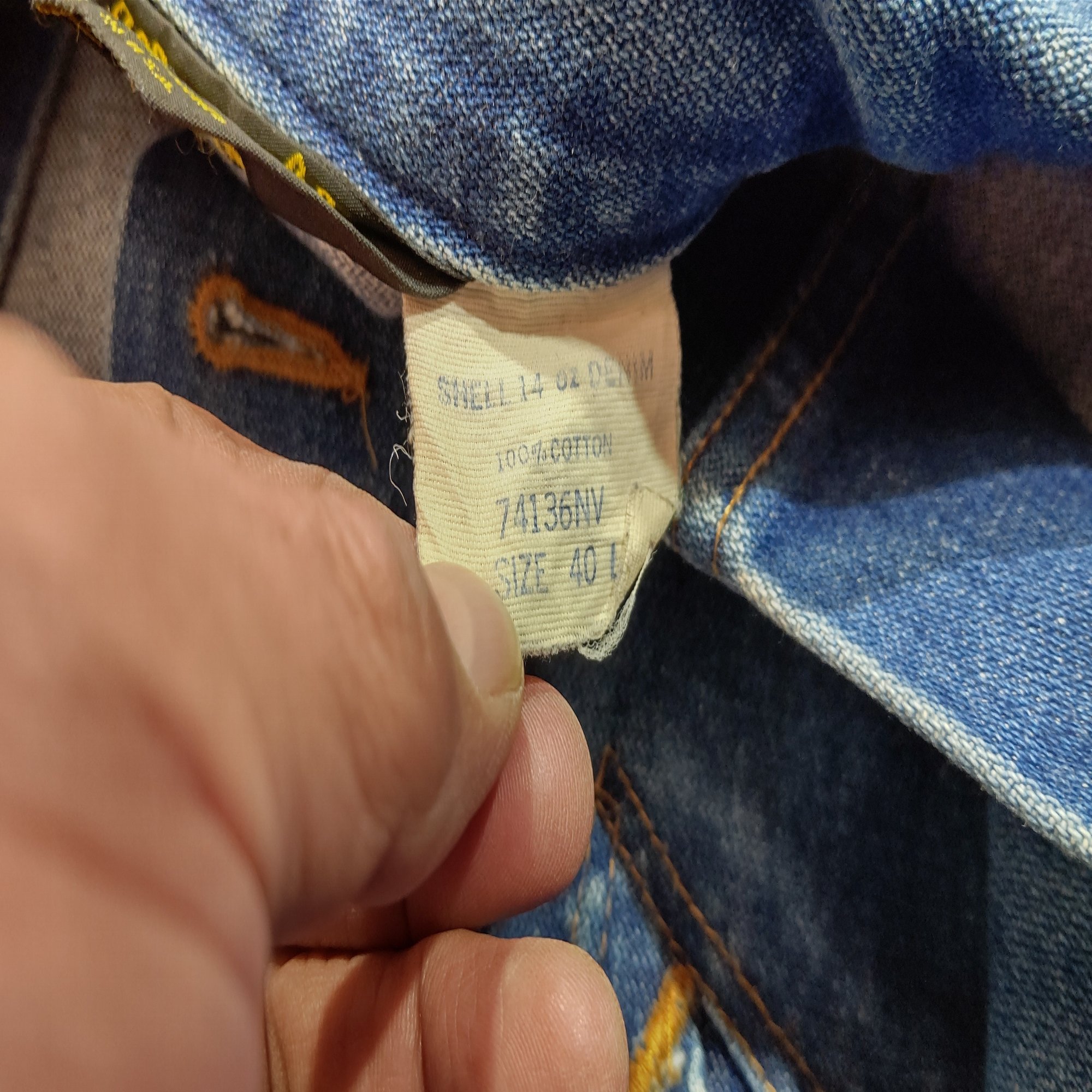 100%COTTON。74136NVは型番らしい。74は1974年か?136は136MJ、NVはNAVY(ネイビー)の略らしい。