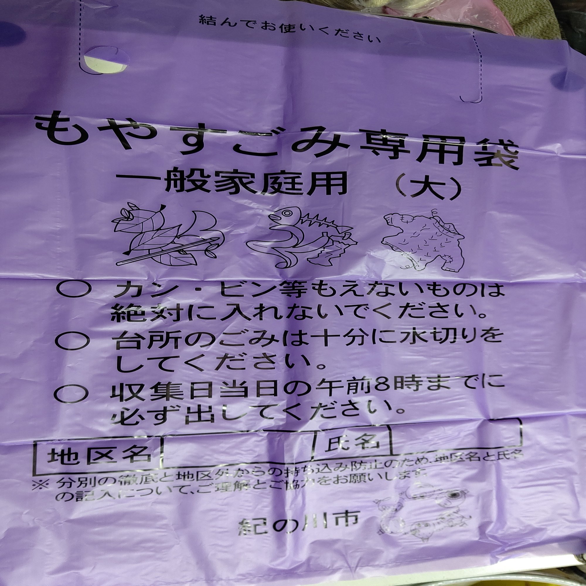 和歌山県紀の川市のもやすごみ専用袋。表示は日本語だけで、分別の徹底と地区外からの持ち込み防止のために記名式だ。