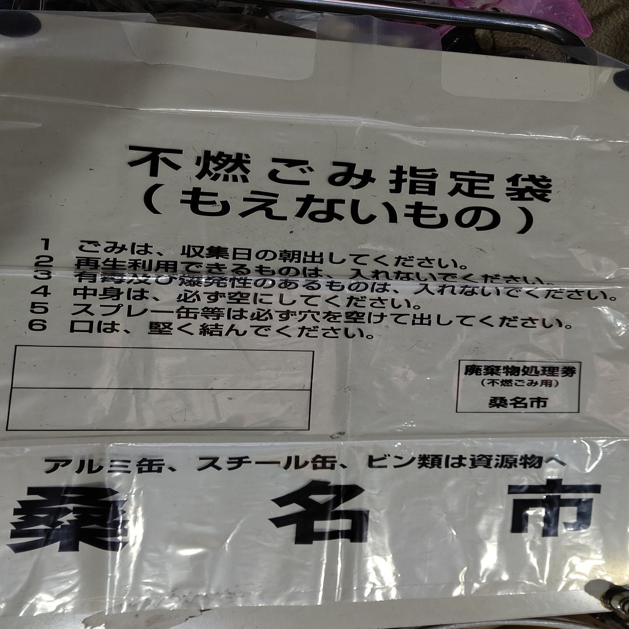 三重県桑名市の不燃ごみ指定袋、日本語表記のみ。廃棄物処理券のプリントがあることから、処理代金が上乗せされているらしい。