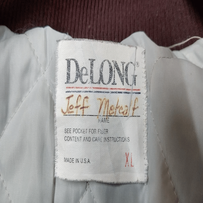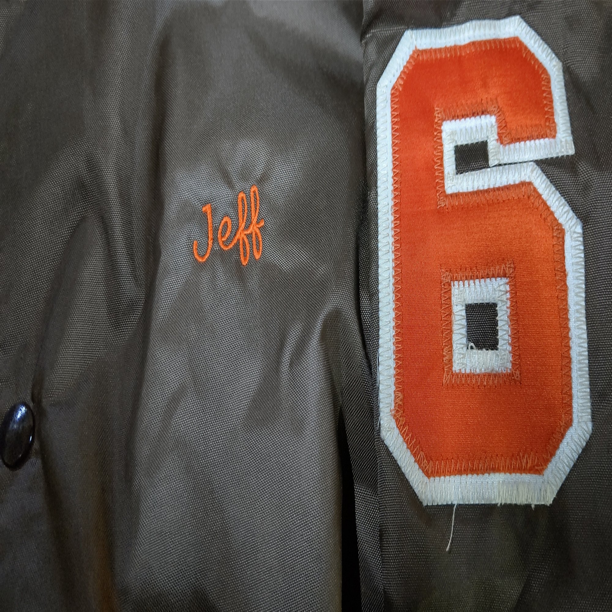 左胸にはJeffのネーム刺繍、左袖に6のワッペン付き。