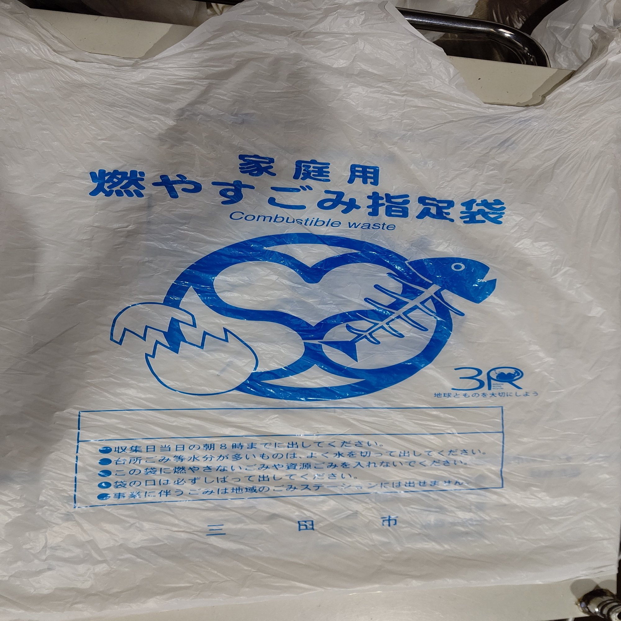 兵庫県三田市の家庭用燃やすごみ指定袋。裏面には「揚げ物の調理中には、コンロから離れないで!」の注意喚起と三田まちづくり憲章がプリントされている。