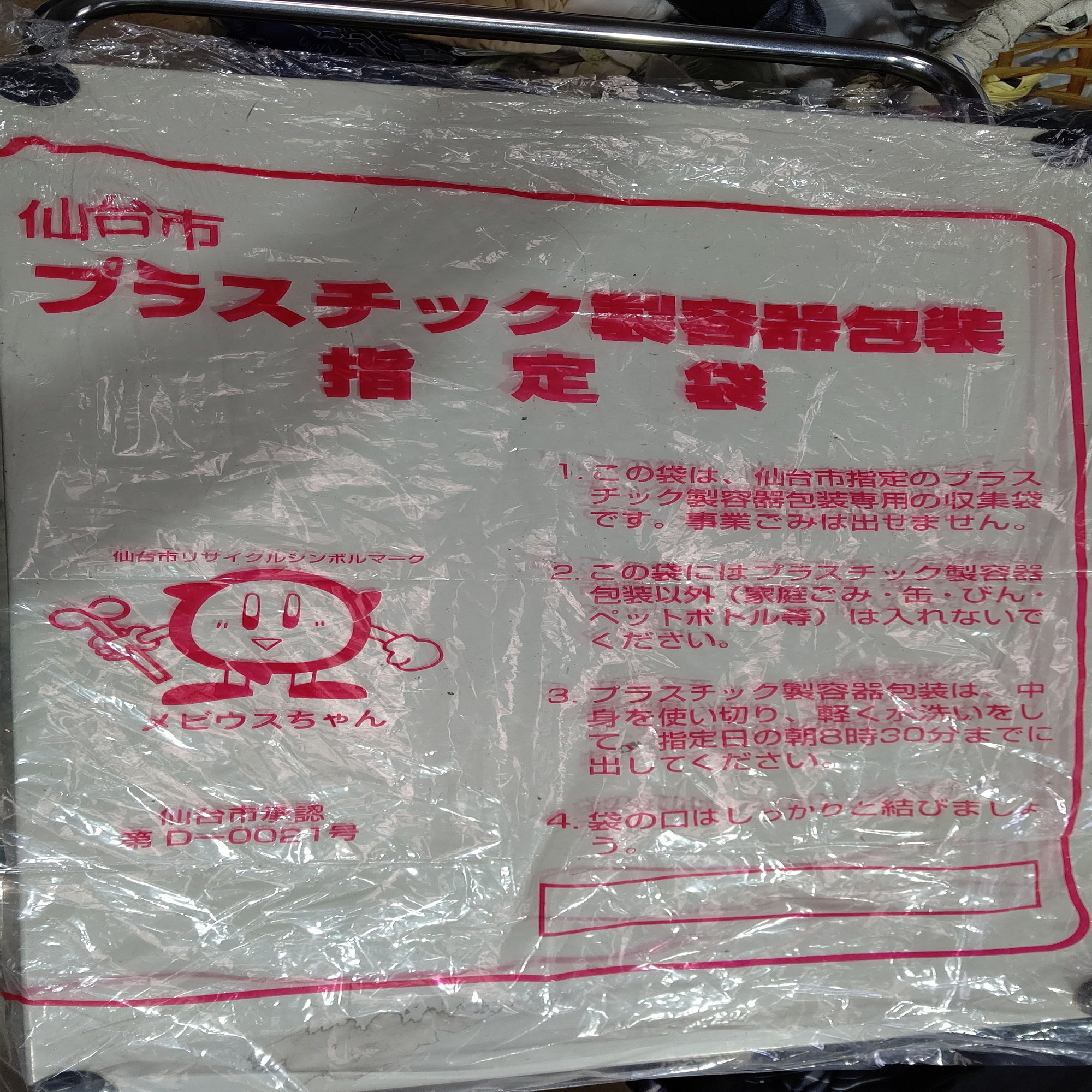 こちらは宮城県仙台市のプラスチック製容器包装指定袋。日本語表記のみ。一応記名欄がある。仙台市リサイクルシンボルマークのメビウスちゃんもプリントされている。