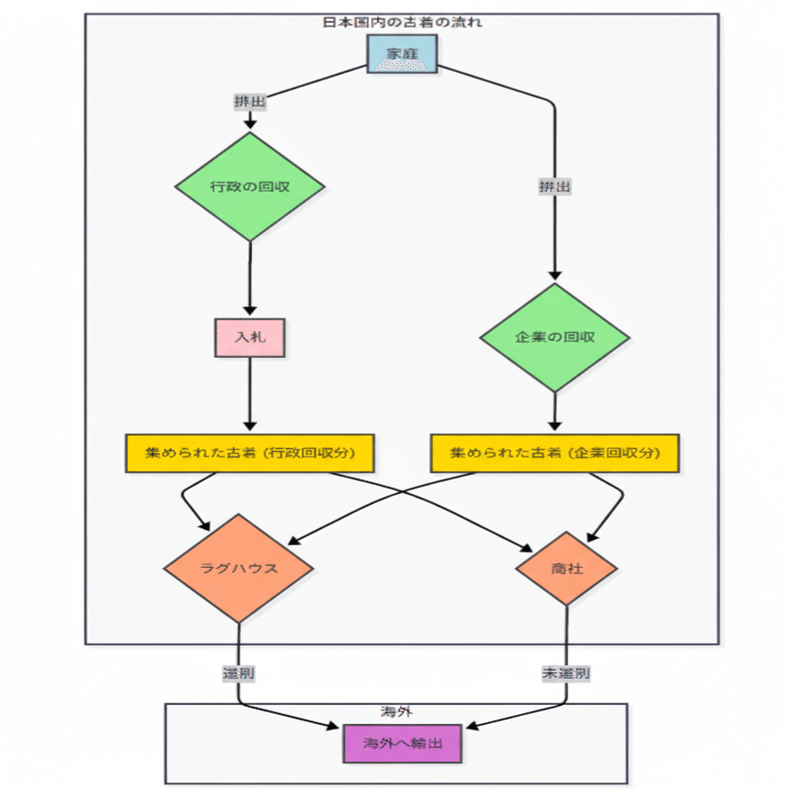 この図は、家庭から排出された古着が、日本国内でどのように流通し、海外へ輸出されるかの流れを示しています。