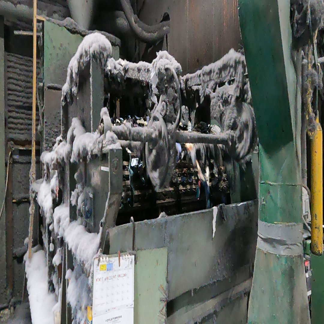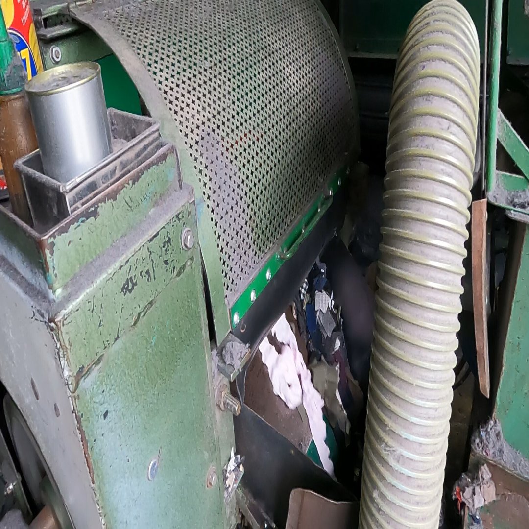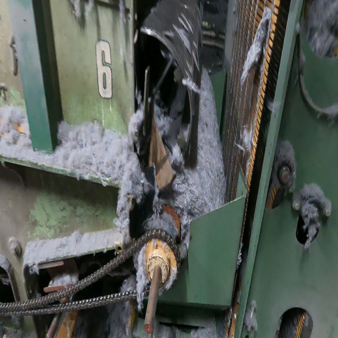 粉砕・開繊: 「反毛機」という剣山のような針がついた機械で、布を引っ掻くようにして細かく引き裂き、フワフワのワタ状に戻します。