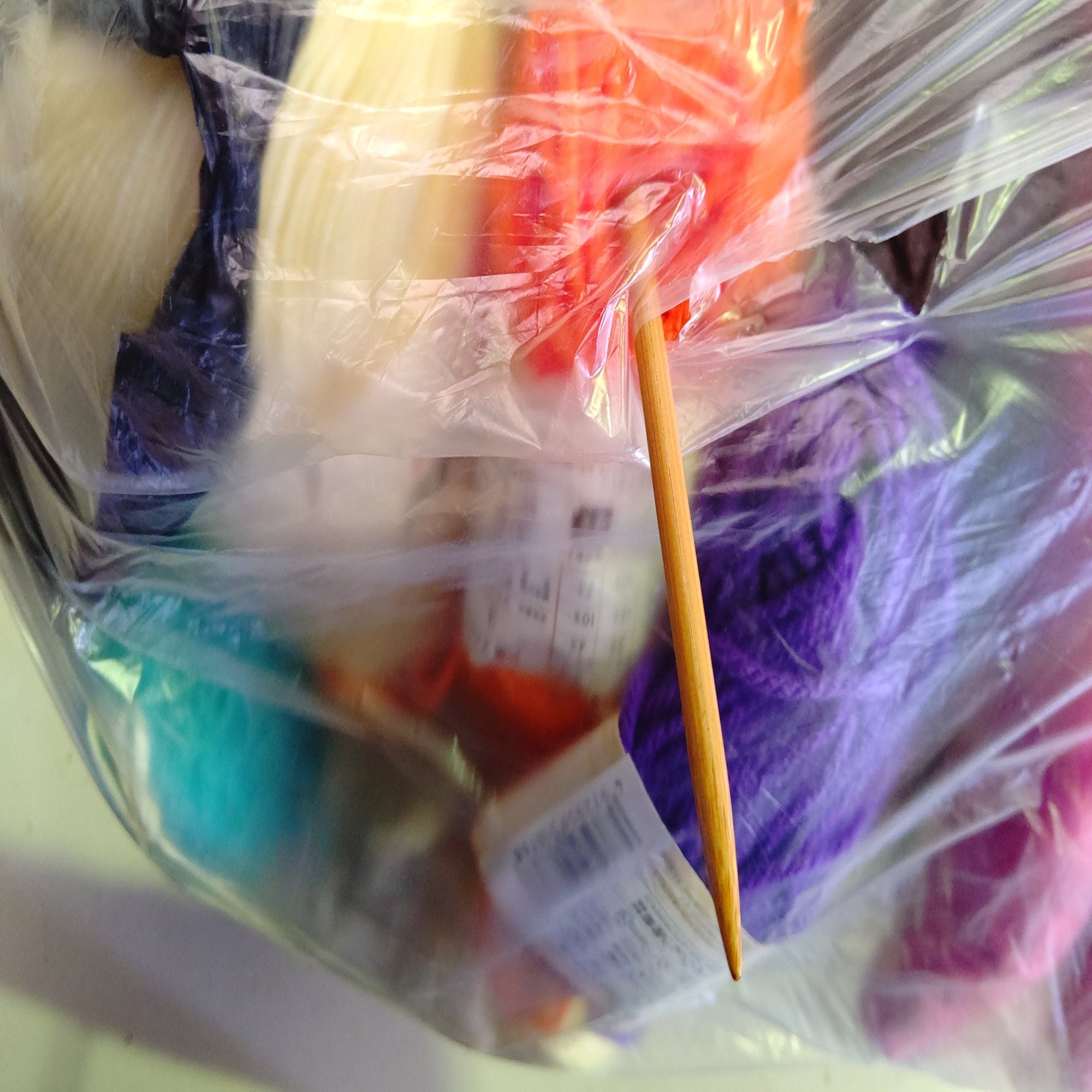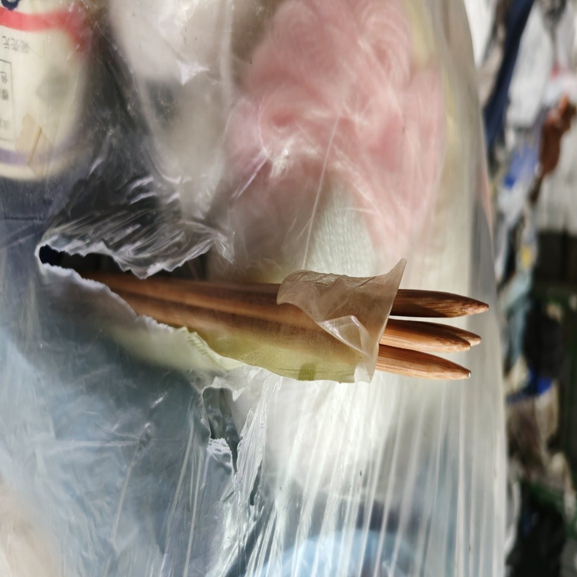 編みかけのマフラーや手袋と一緒に出て来る編み棒🧶です。この編み棒は曲者です、ビニール袋を突き破り飛び出してくる凶器なんですよ!!