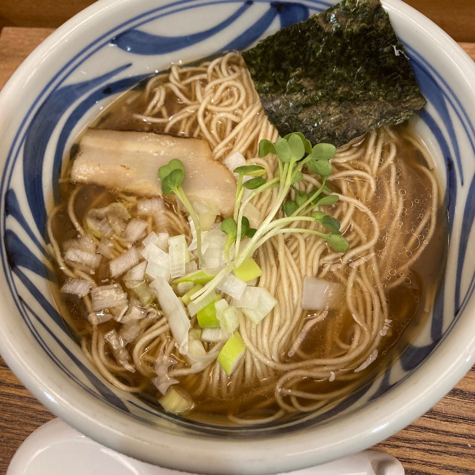 スープには、あご出汁をメインに魚介系を強く感じて、全粒粉を多めに加えた細麺の効果もあって蕎麦も思わせる。チャーシューも控えめな大きさ。揚げたての天ぷらとの相性もよく、乗せて「天ぷら中華」にしてみるのも楽しい。BGMが落語というのも一興(^o^)