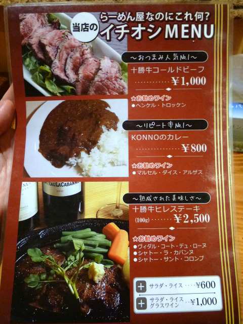 メニューはラーメンとワインとステーキなどワインに合うアラカルト。ヒレステーキ2500円やシャトーブリアン3000円などがラーメンと一緒に楽しめちゃいます(^^; 自分は豚鶏麺 醤油、同行者はワインをお願いしました。