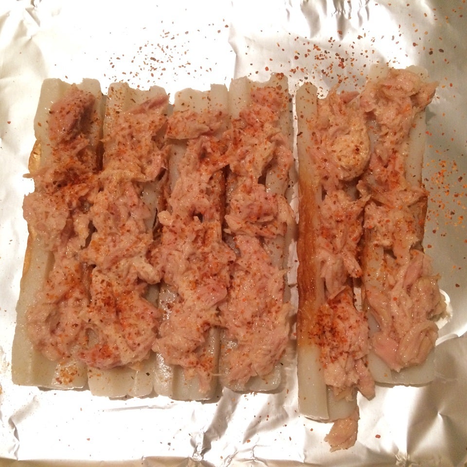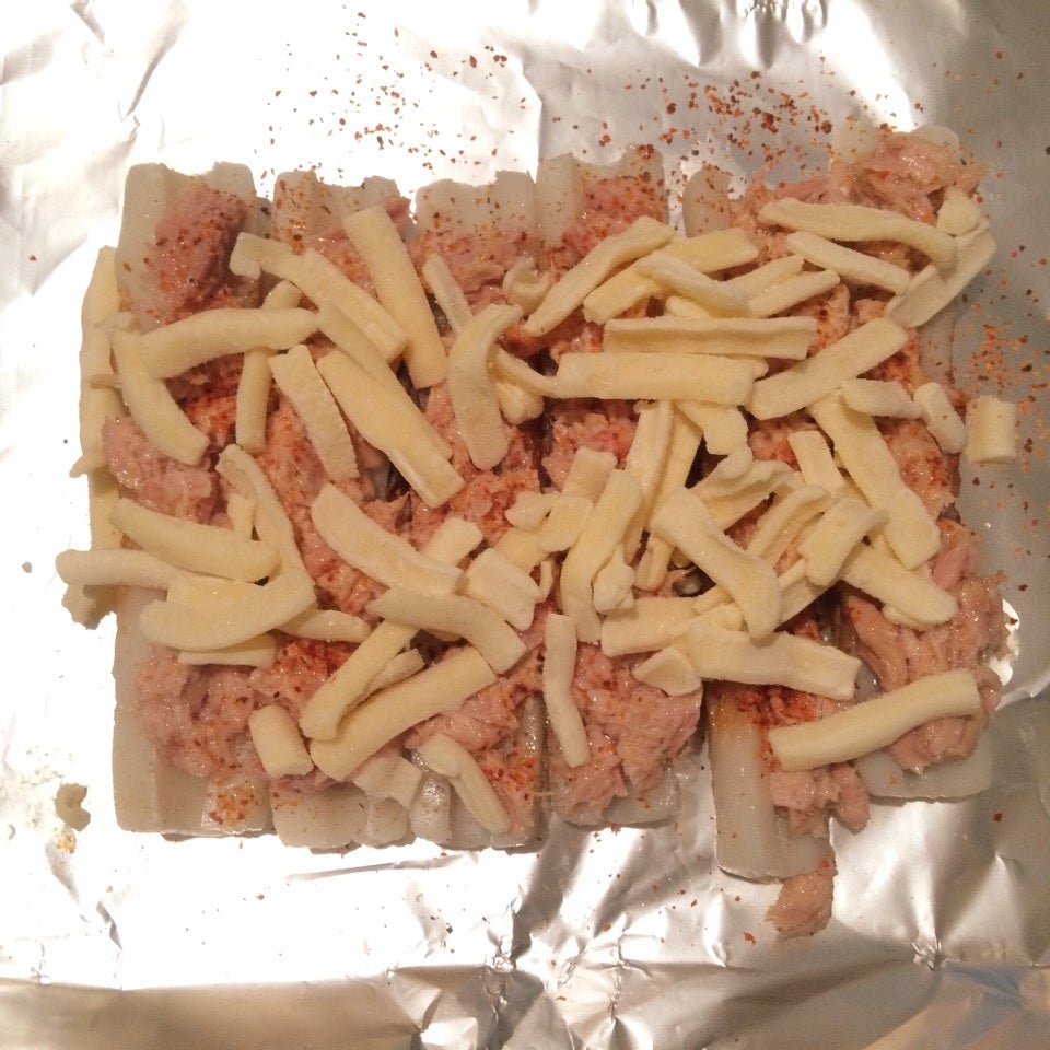 ちくわを縦に半分に切り、ツナマヨを乗せる。