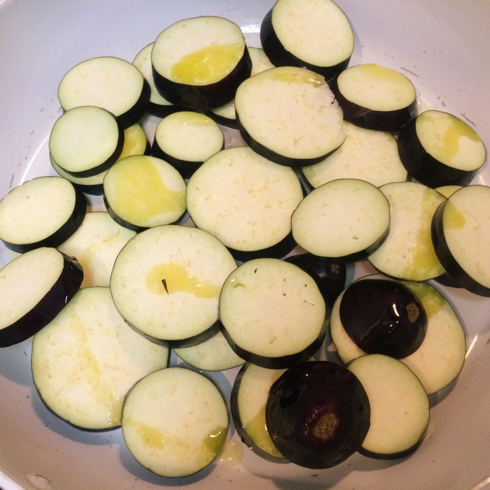 そのあと、フライパンにオリーブオイルを敷いて、ナスを炒める。
