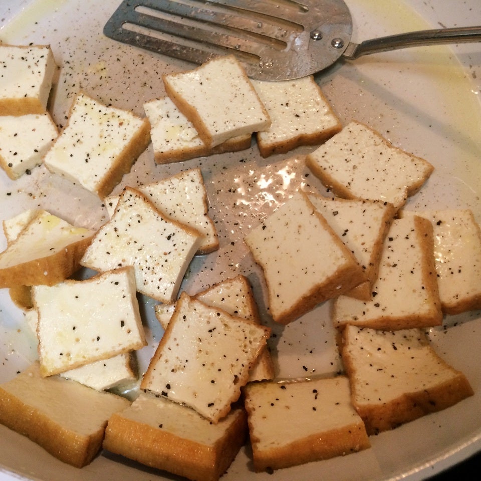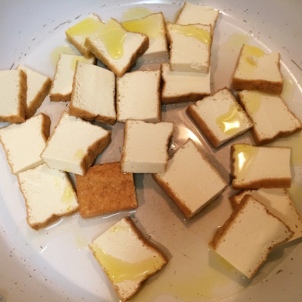 そのあと適当な厚さに切った厚揚げをオリーブオイルを足して焼く。