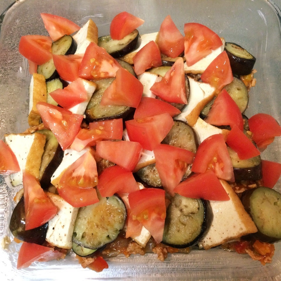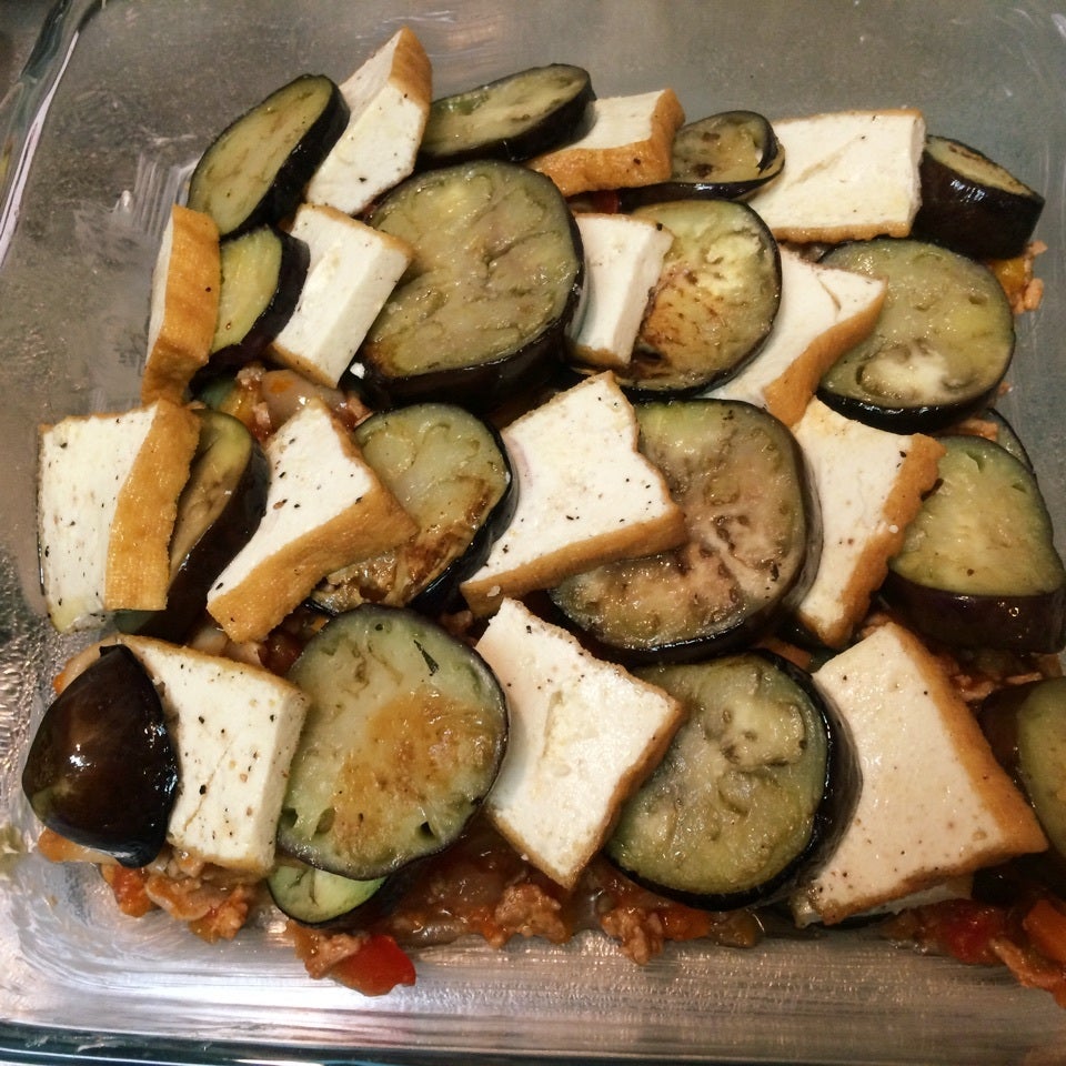 ⑤にまたミートソースを重ね、またナスと厚揚げを交互に並べる。
