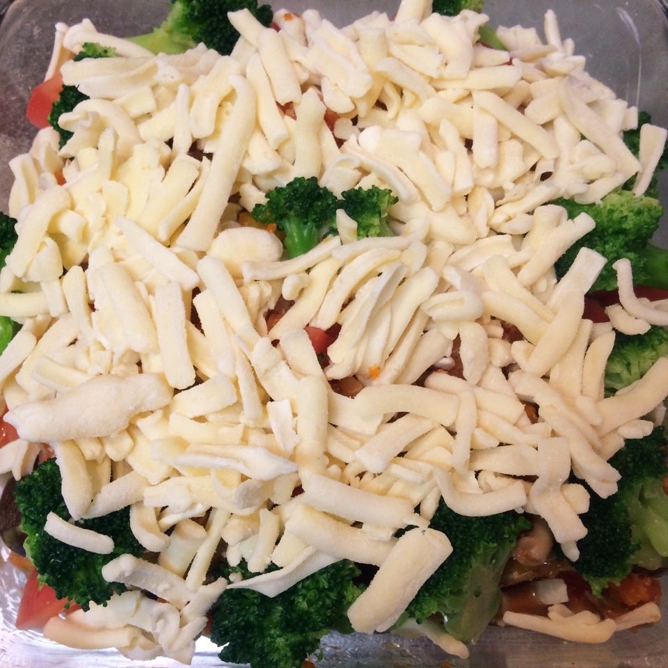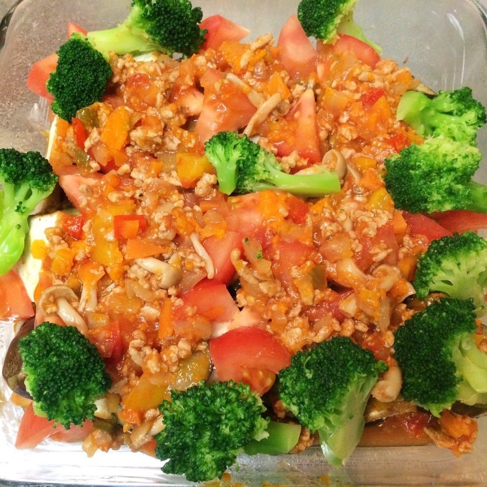 ミートソースを満遍なくかけ、茹でたブロッコリーを乗せる。