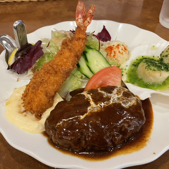 店の看板メニューは、エビフライらしいのですが、ランチは別途日替わりのランチメニューがあって、ライスとスープ付きで1000円とお安かったのもあり、迷った挙句、ランチセットにしました![]()