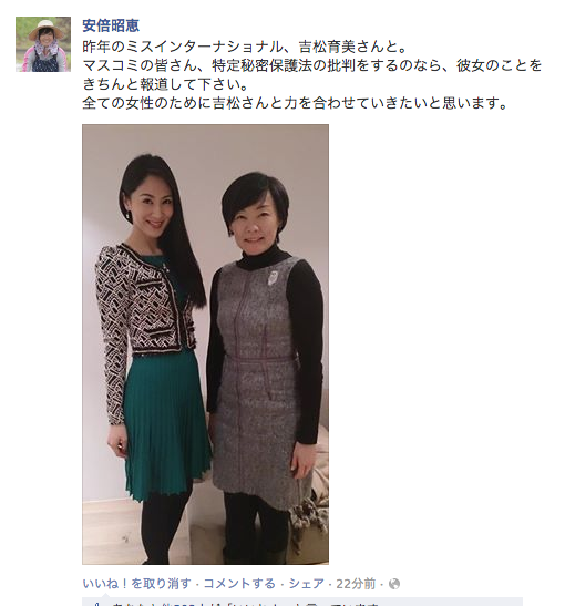昨年のミスインターナショナル、吉松育美さんと。 マスコミの皆さん、特定秘密保護法の批判をするのなら、彼女のことをきちんと報道して下さい。 全ての女性のために吉松さんと力を合わせていきたいと思います。 pic.twitter.com/TWDDOYQQNK