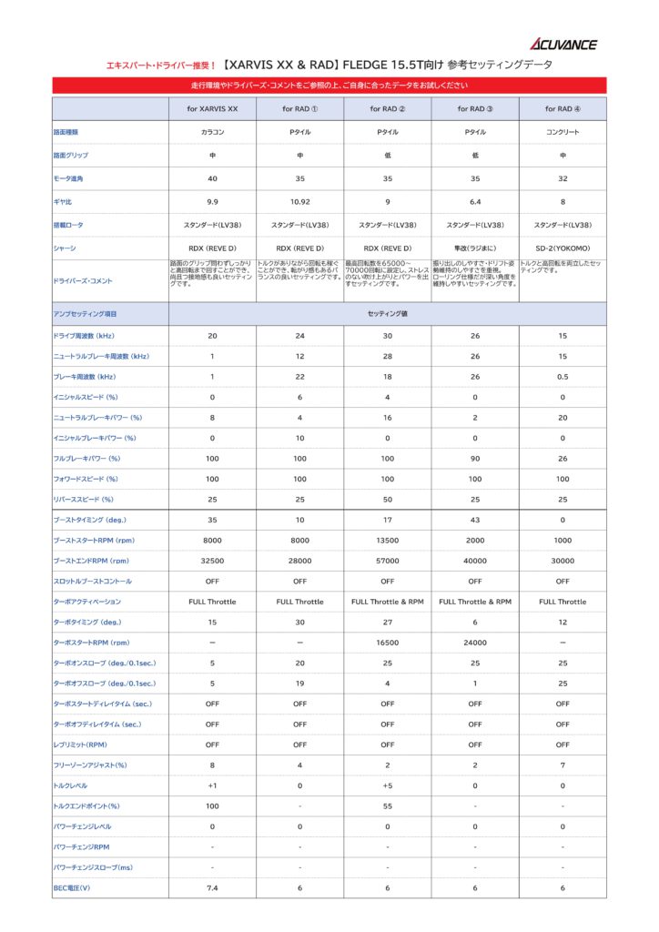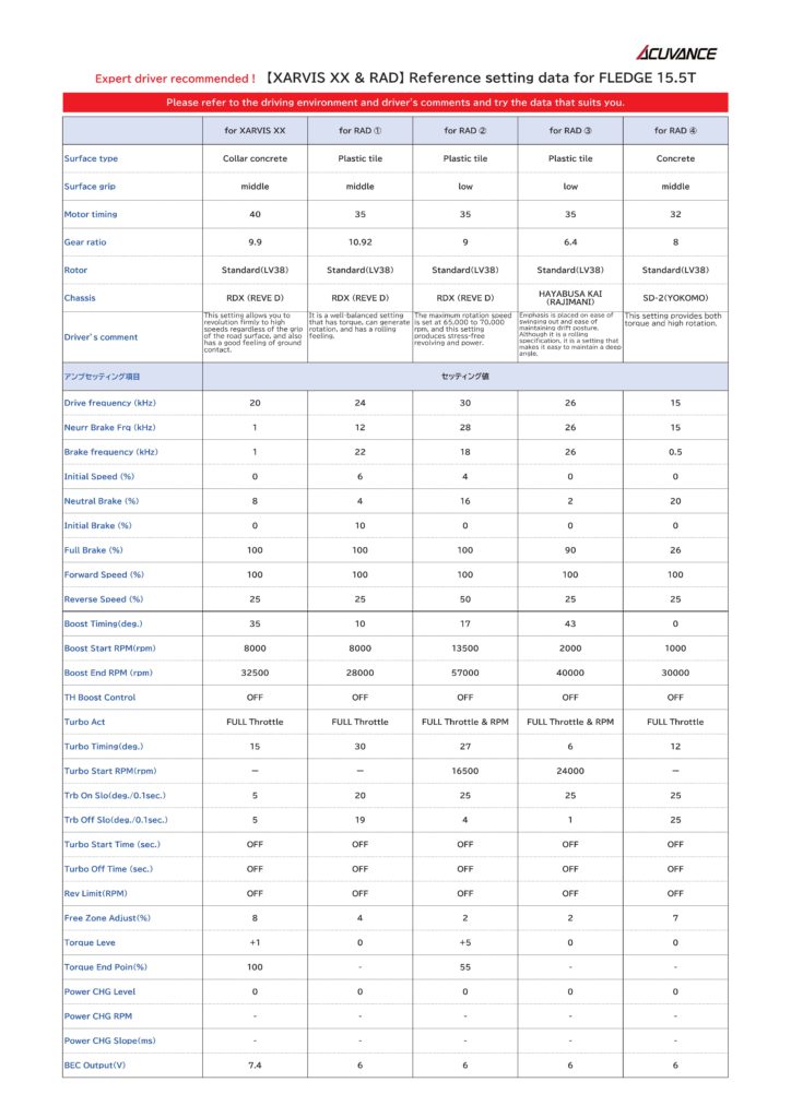 FLEDGE 15.5T搭載時のセッティングに関し多くのご質問をお寄せいただいております状況を受け、実際に15.5Tを愛用されているエキスパート・ドライバーの皆様が使用するデータをご紹介いたします。