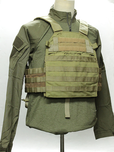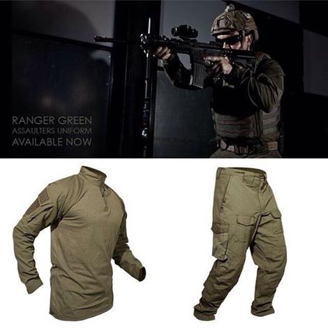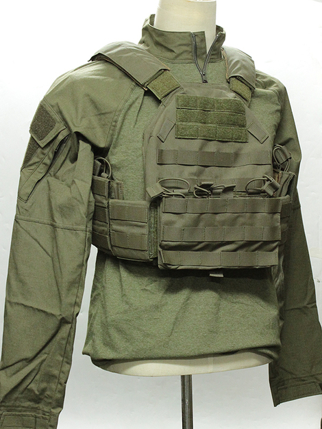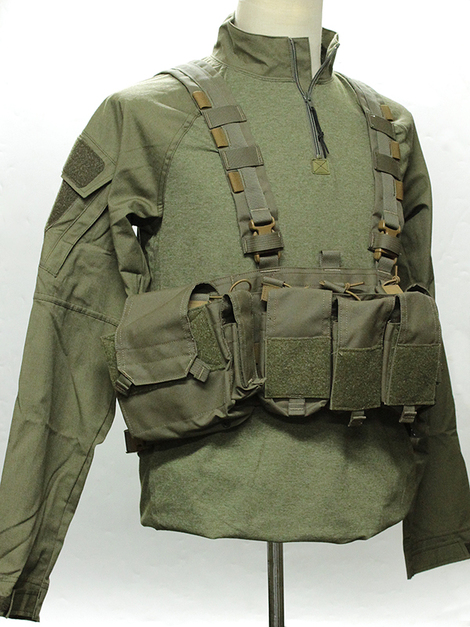 レンジャーグリーン・チェストリグ:コンバットシャツにチェストリグの組み合わせは軽快に動けて、激しい運動をする方に最適です。涼しいです。同系色で組み合わせもあっています。レンジャーグリーンのパンツをはいたときにベルトをブラックにして区切りをだすのも良いと思います。
