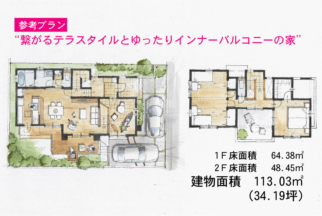 ステイドリーム高倉台3号地は、繋がるタイルテラスとゆったりインナーバルコニーの家