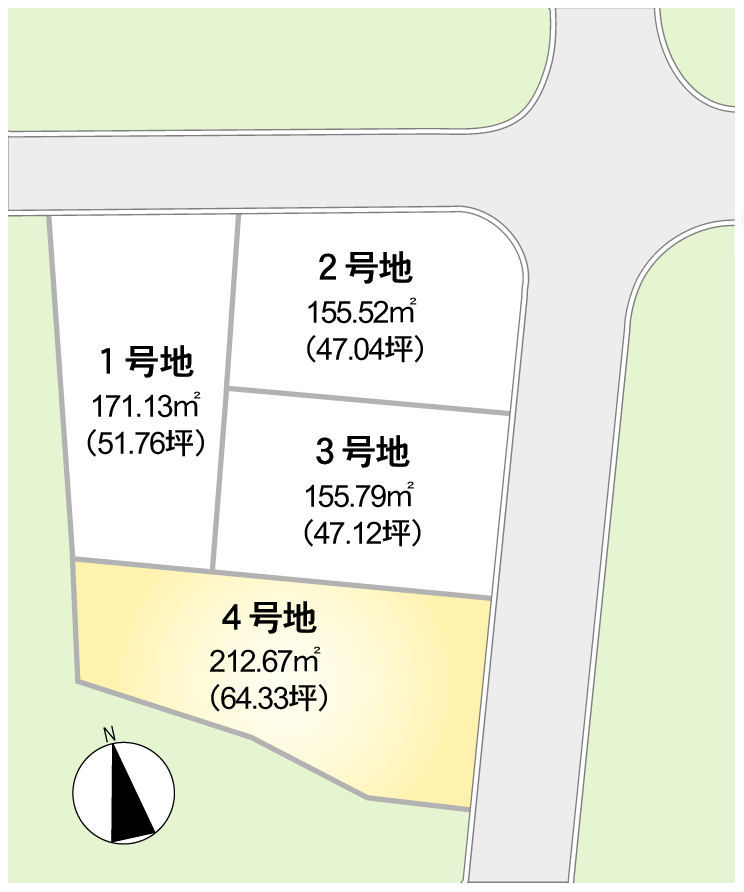 全4区画 敷地面積155.52㎡(47.04坪)~212.67㎡(64.33坪)