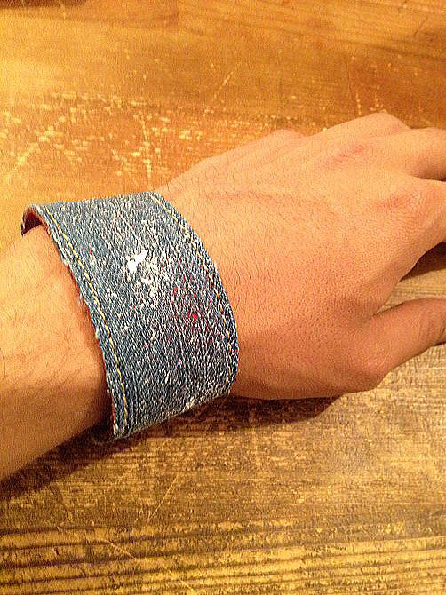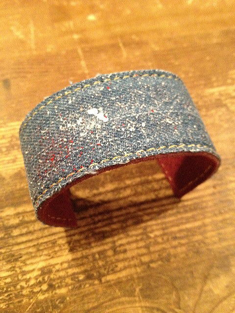 FADEサイドに10ozのデニム、BACKサイドにはカウハイドスエードを使用してあり,裏地と表生地の間に真鍮の板を入れてあるので、自由にサイズ調節ができ36mm幅のバングルタイプです。