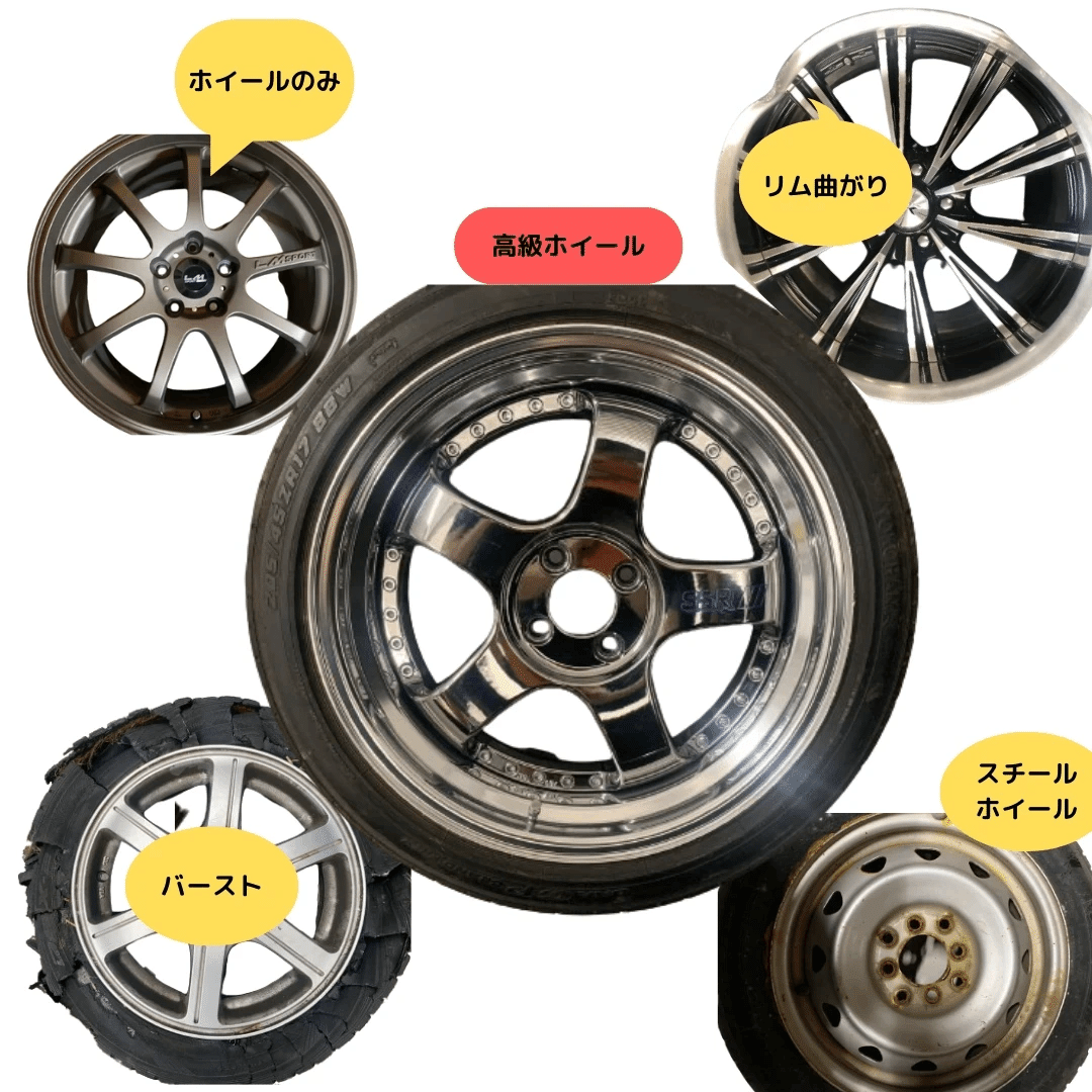 リム曲がりやワイヤーが出ている使えないタイヤが付いていたとしても、買取り致します。
