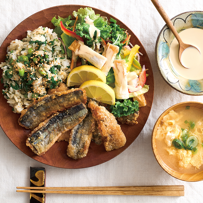 『北海道ザンギ風さんま唐揚げ』、ちくわと10品目の彩り和サラダ、かきたまみそ汁、春菊の香味ごはん(2人分)|だいどこログ[生協パルシステムのレシピサイト]さんまはカリッと揚げ焼きで♪ 香味豊かな秋のプレートごはん。daidokolog.pal-system.co.jp