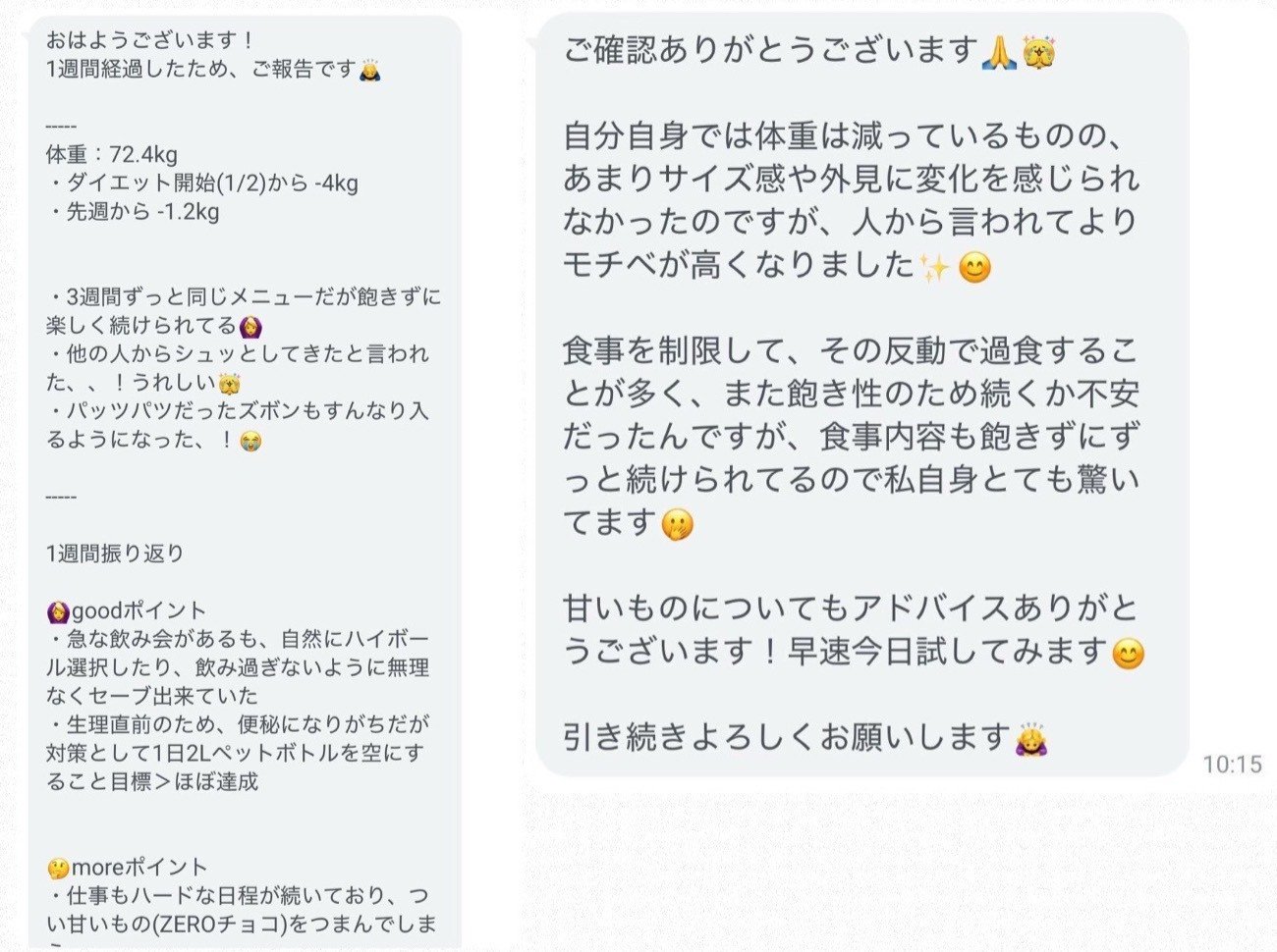 記録をまとめて提出したり、週1回の報告をこなすだけでなく、リアルタイムで相談できる。この「すぐ聞ける」という感覚が、途中で諦めることなく3ヶ月を走り切る支えになりました。