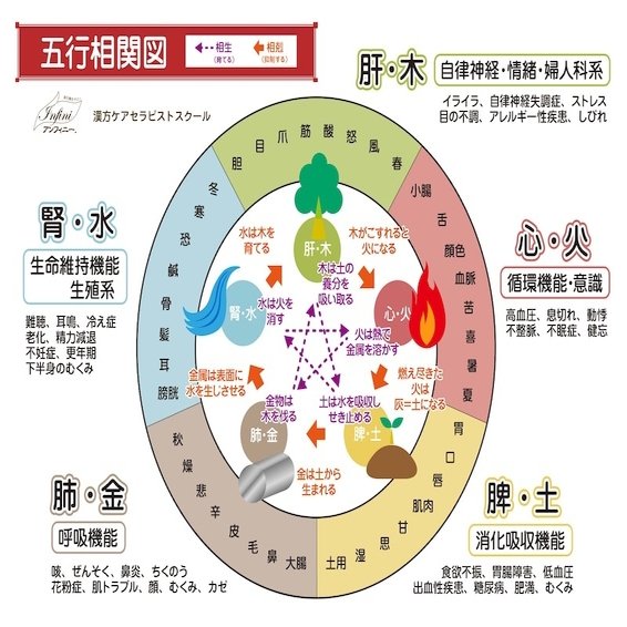 自然界のあらゆるものは「木・火・土・金・水」の5つの要素に分類でき、これらは相互に助け合ったり、抑制し合ったりすることで自然界のバランスを保っているという考え方。助ける関係を相生、抑制する関係を相克という。