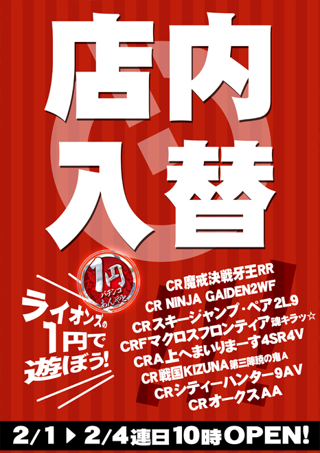 今月のライオンズどうも つぶやき店長です 本日より2月 そして・・・ 1日と言えば・・・ ライオンズで ④倍遊ばないと!! 最新機種・・・ 牙王、戦国、スキーが エリア最速! 「遊び」伝えます♪ 是非!!お楽しみください♪ BYつぶやき店長