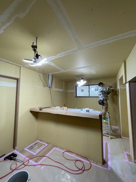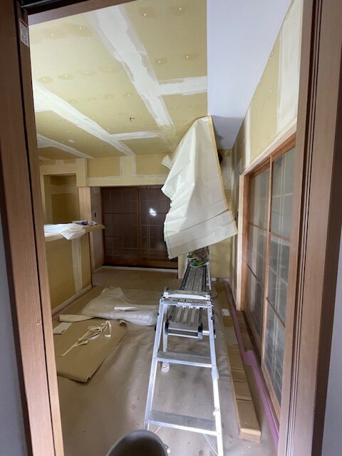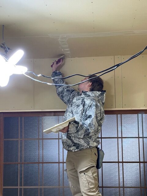 クロス屋さんが下地のパテ処理に来てくれました。