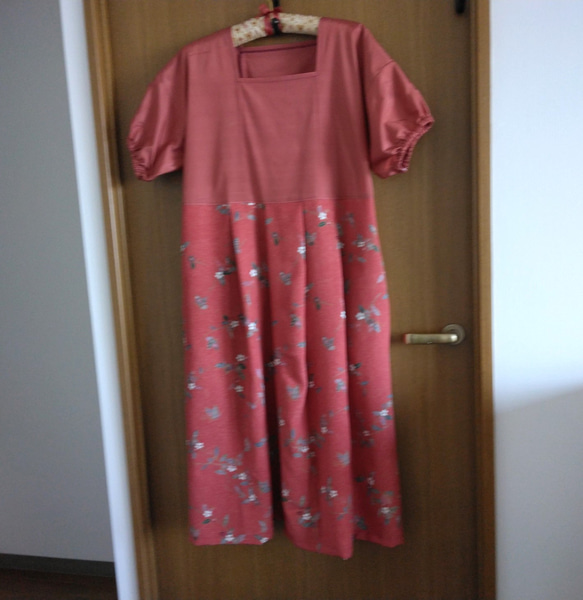 今回はそんな余っていた八掛と着物地を使用して、スクエアネックのウエスト切り替えタックワンピースを作ってみました