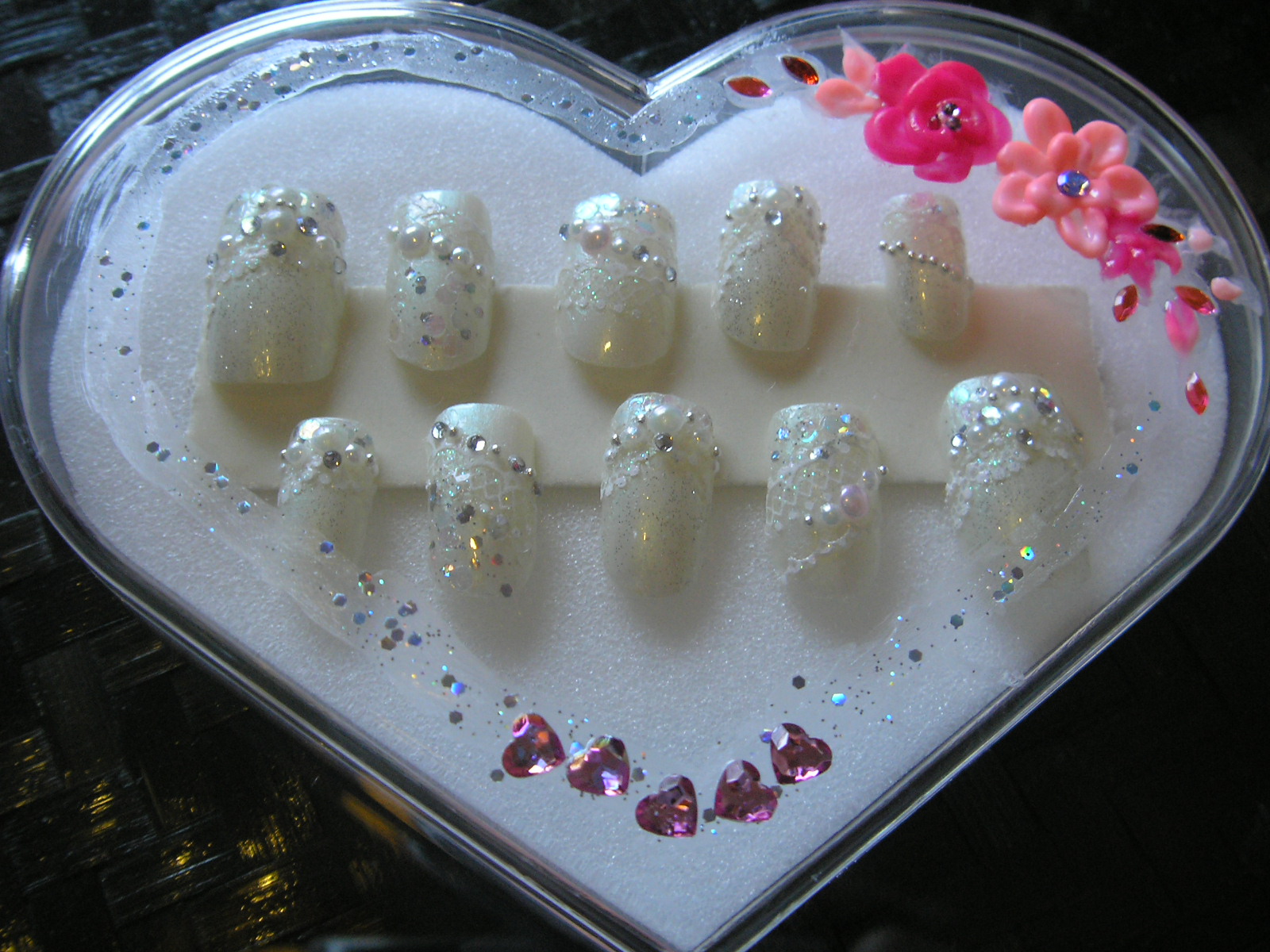 ブライダルネイル♪もうすぐ今月末に結婚式を控えたY様ウェディングドレス用のネイルチップをオーダーいただきましたオーダーだと爪の形や大きさにキッチリ合わせて作るのでフィット感がいいんですよねしかもデザインはお好み次第Y様のご希望で夏らしく透明感があって優しい感じでパールとかレースとかキラキラも大好きなのでゴージャスに仕上げました
