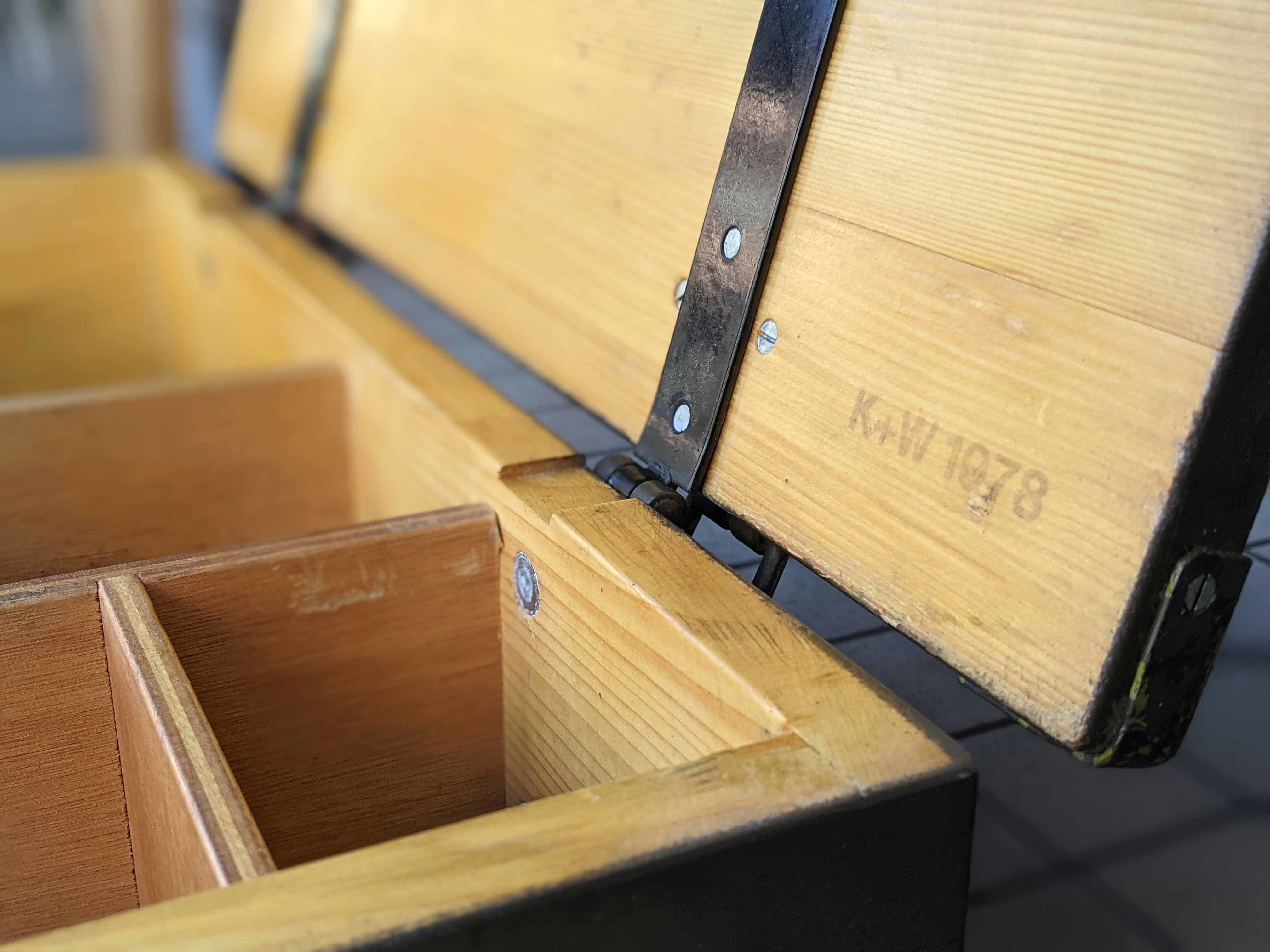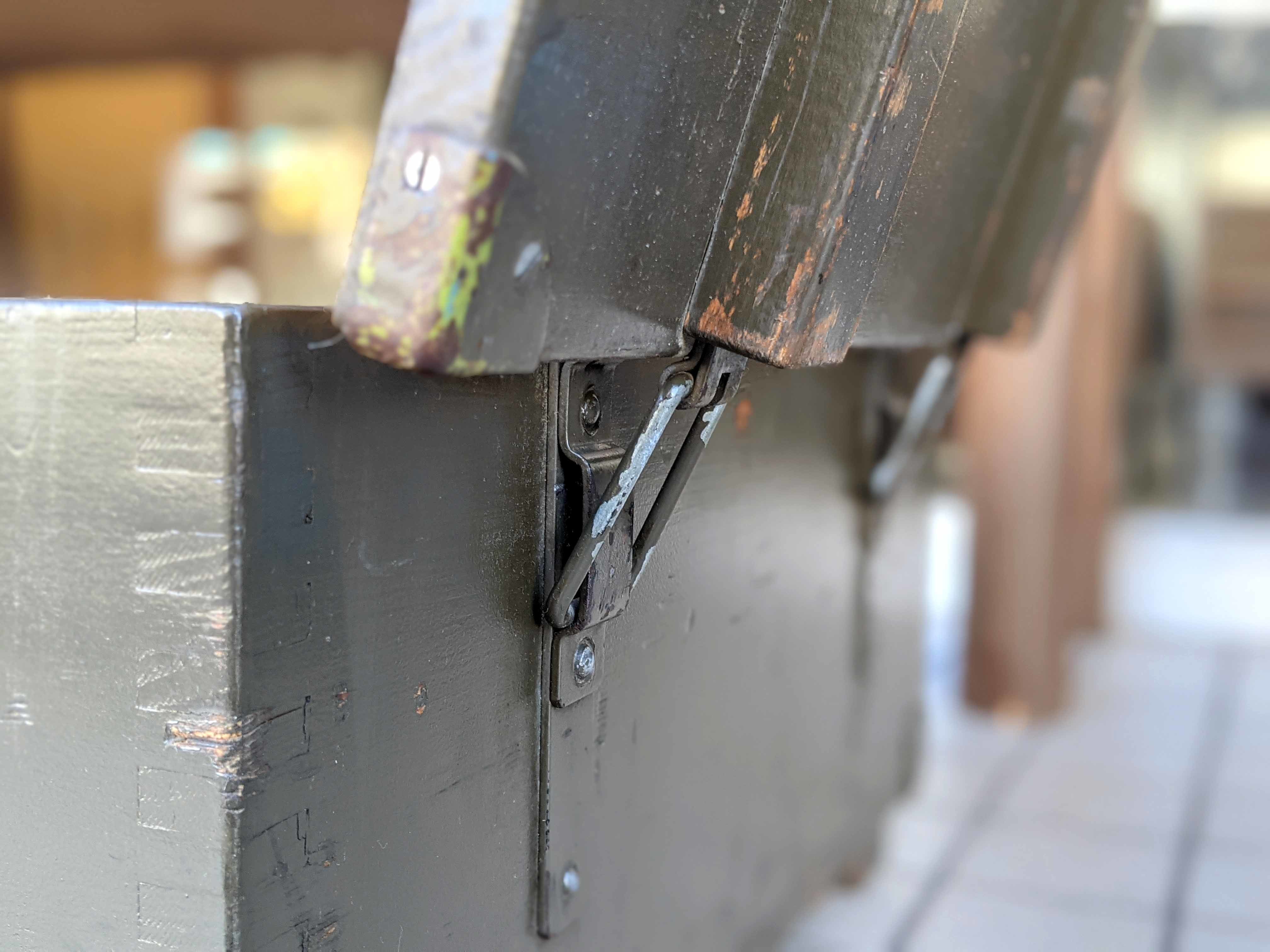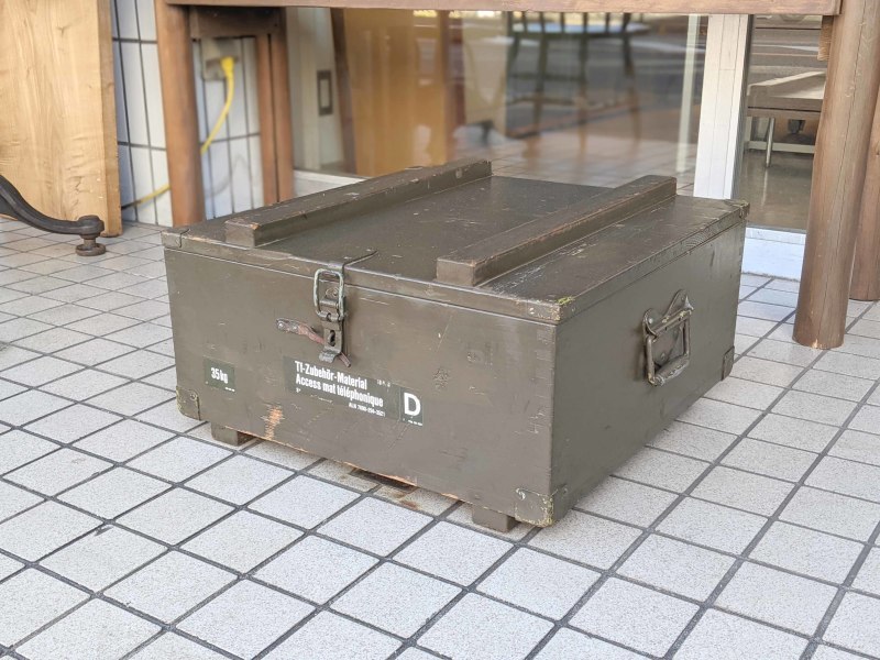 主材はパイン無垢材で造られ、角部は補強金具が取り付けられ堅牢な造り