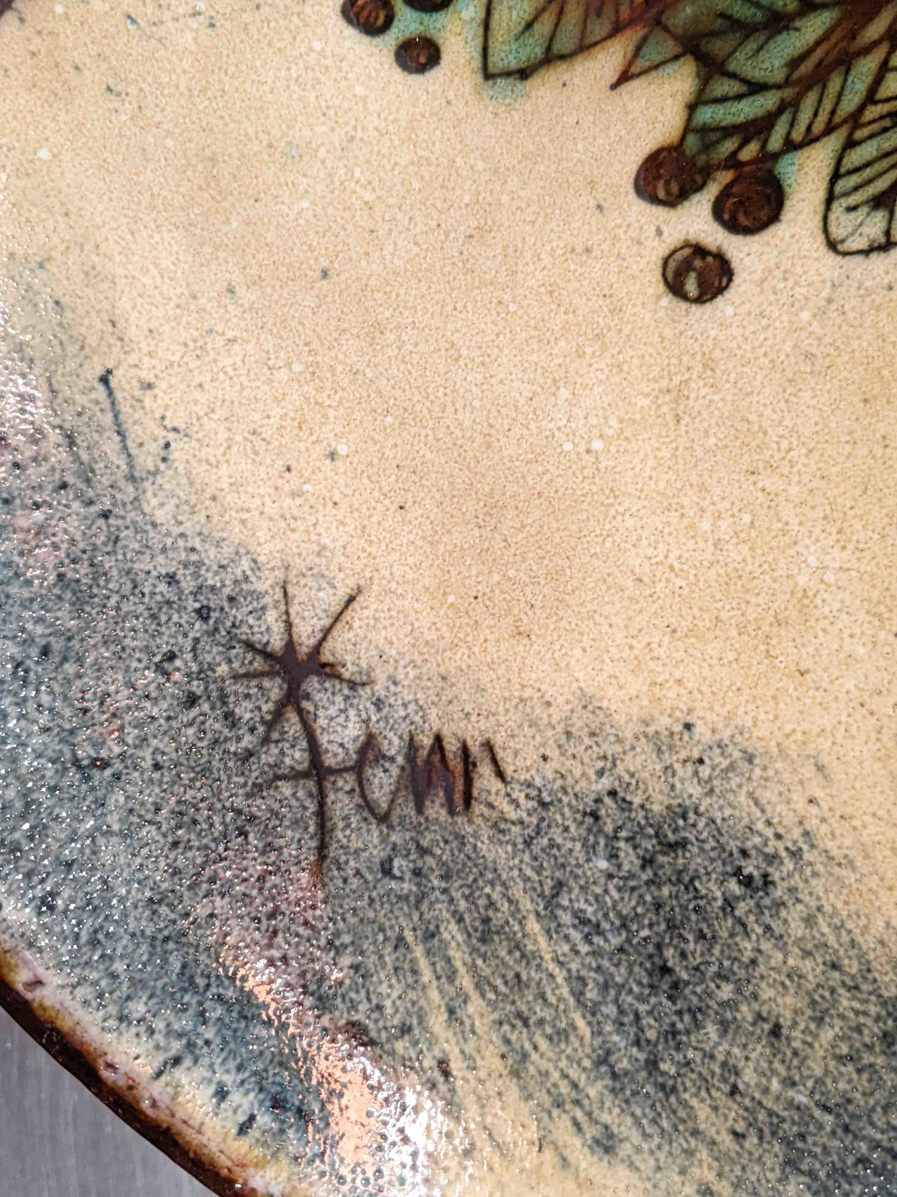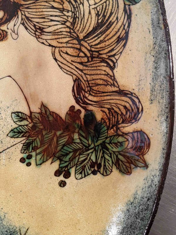 乾燥後そっと掻き落し、色釉を重ね焼成する事で