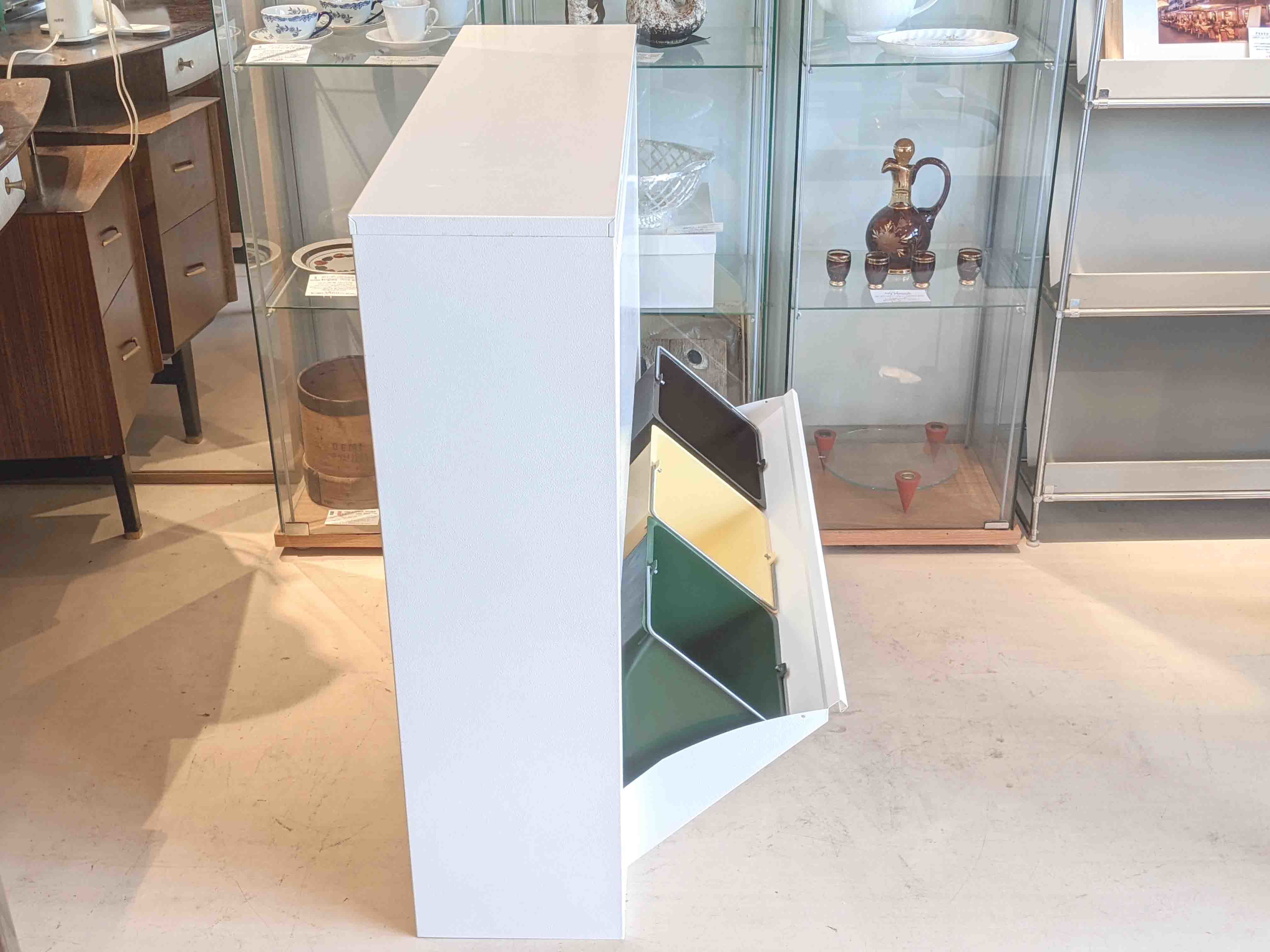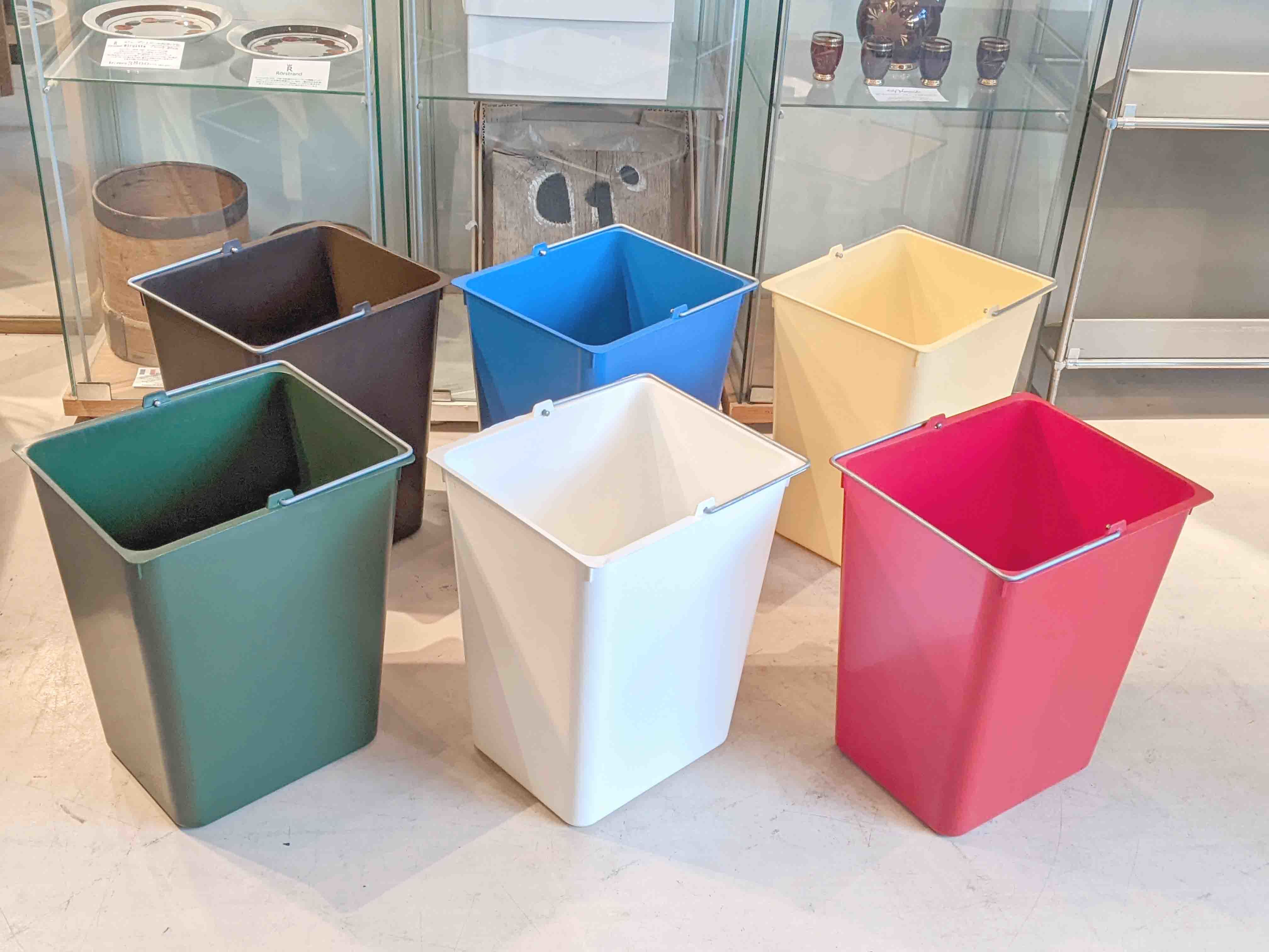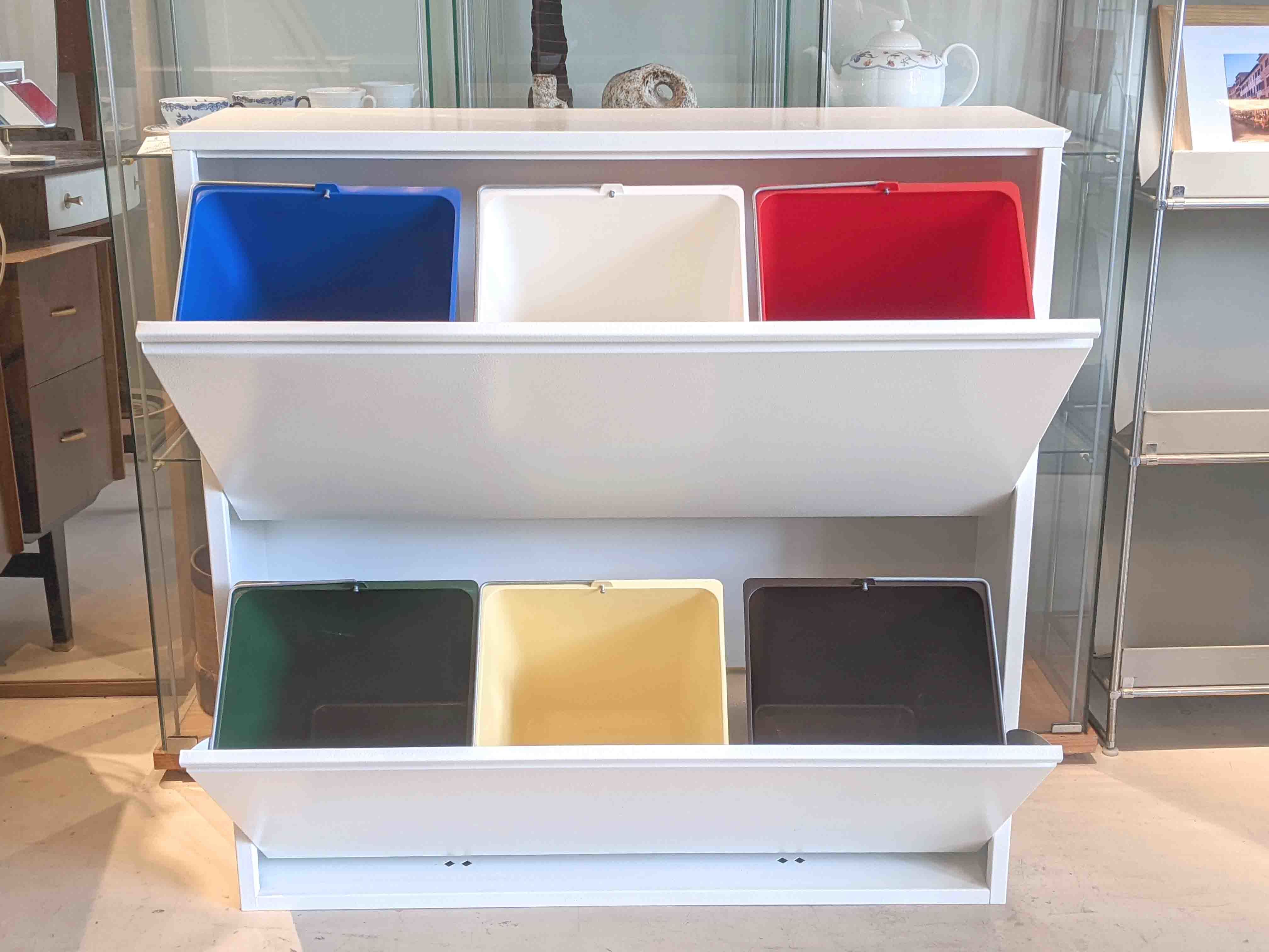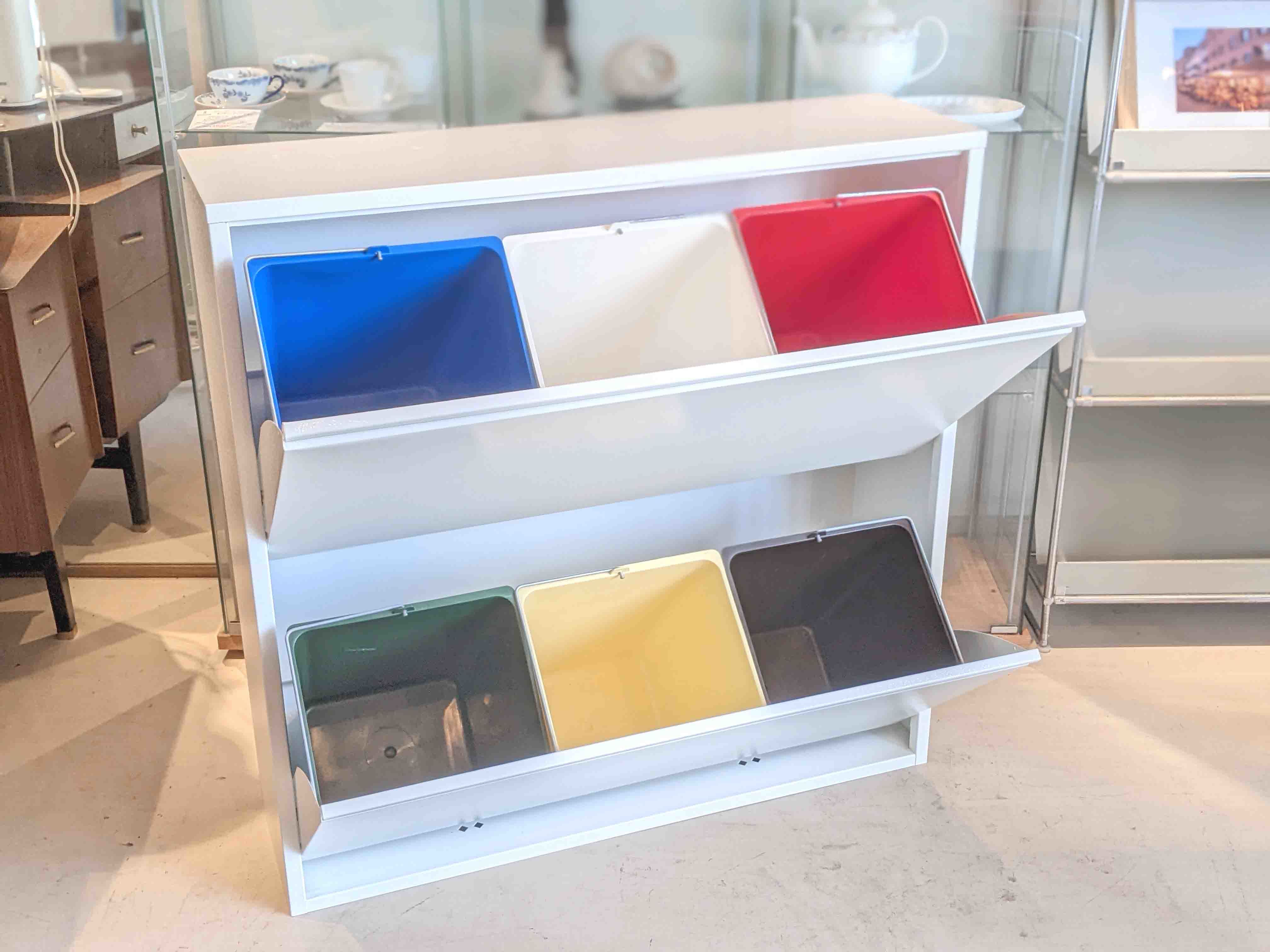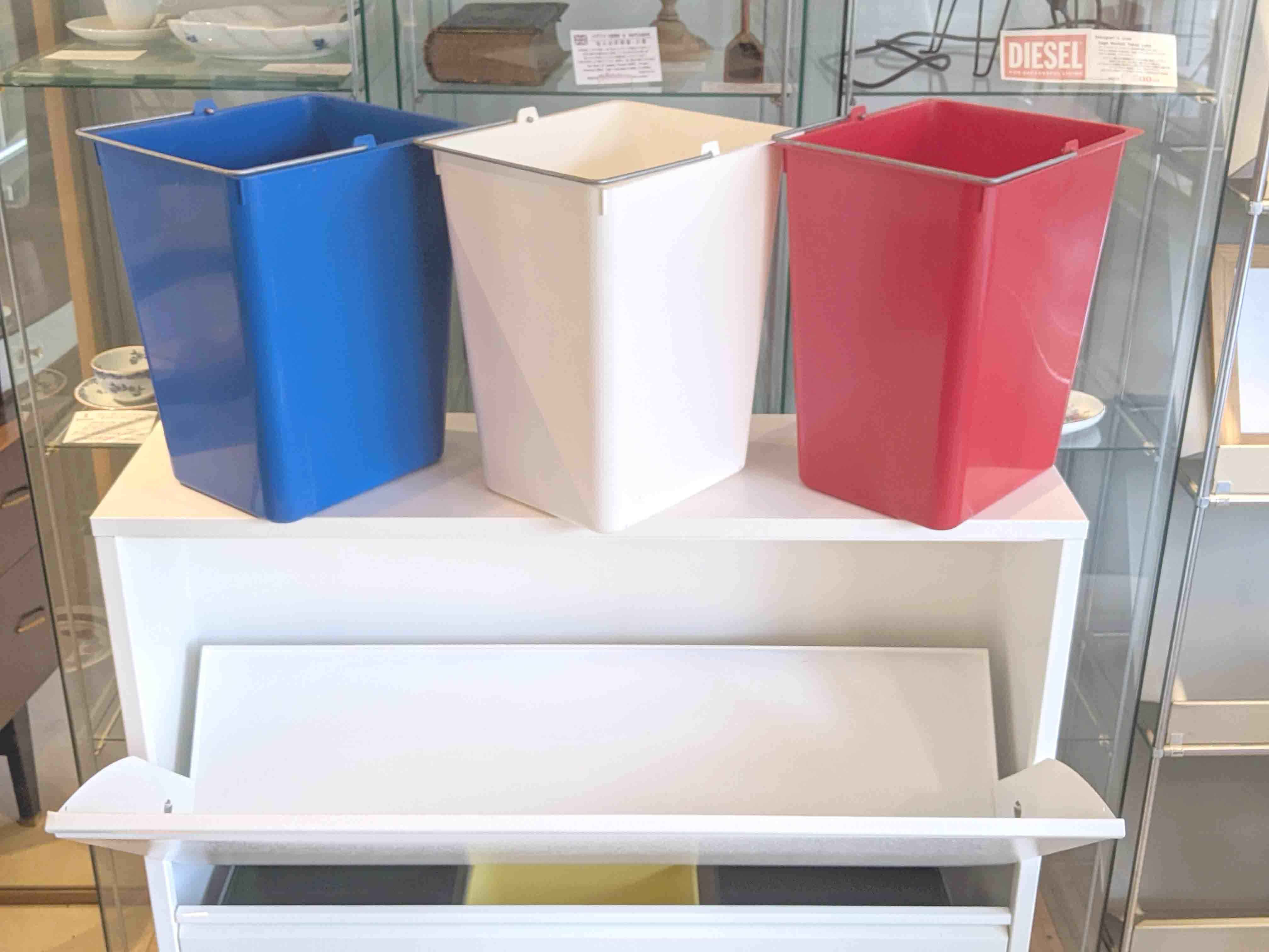 正面の持ち手を引くと、上下にカラフルなダストビンが収納されています