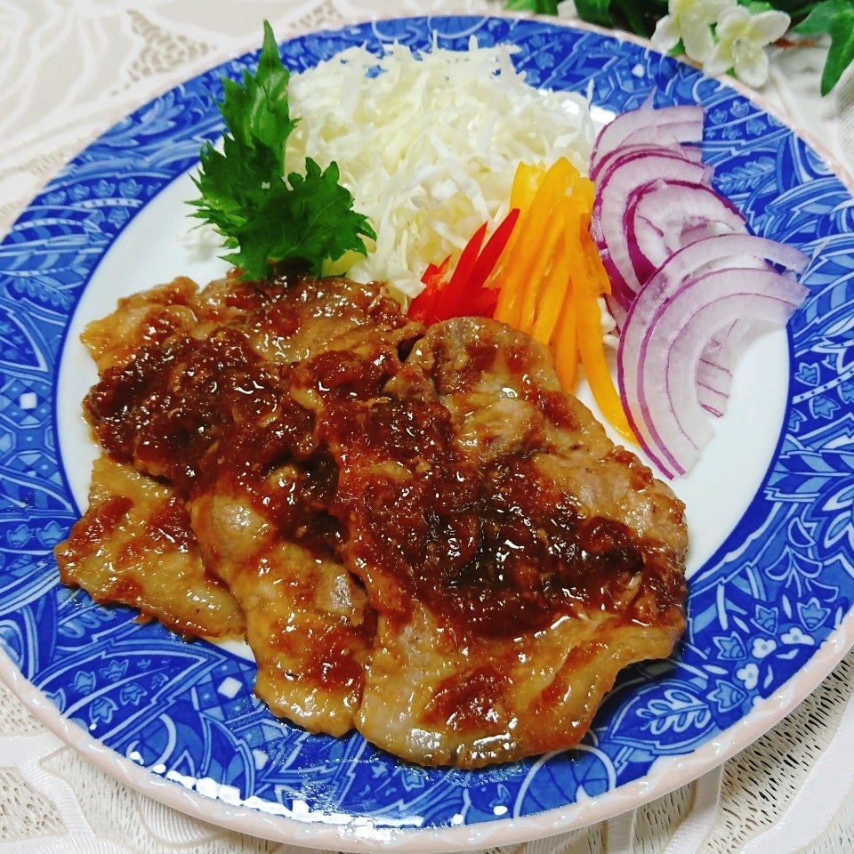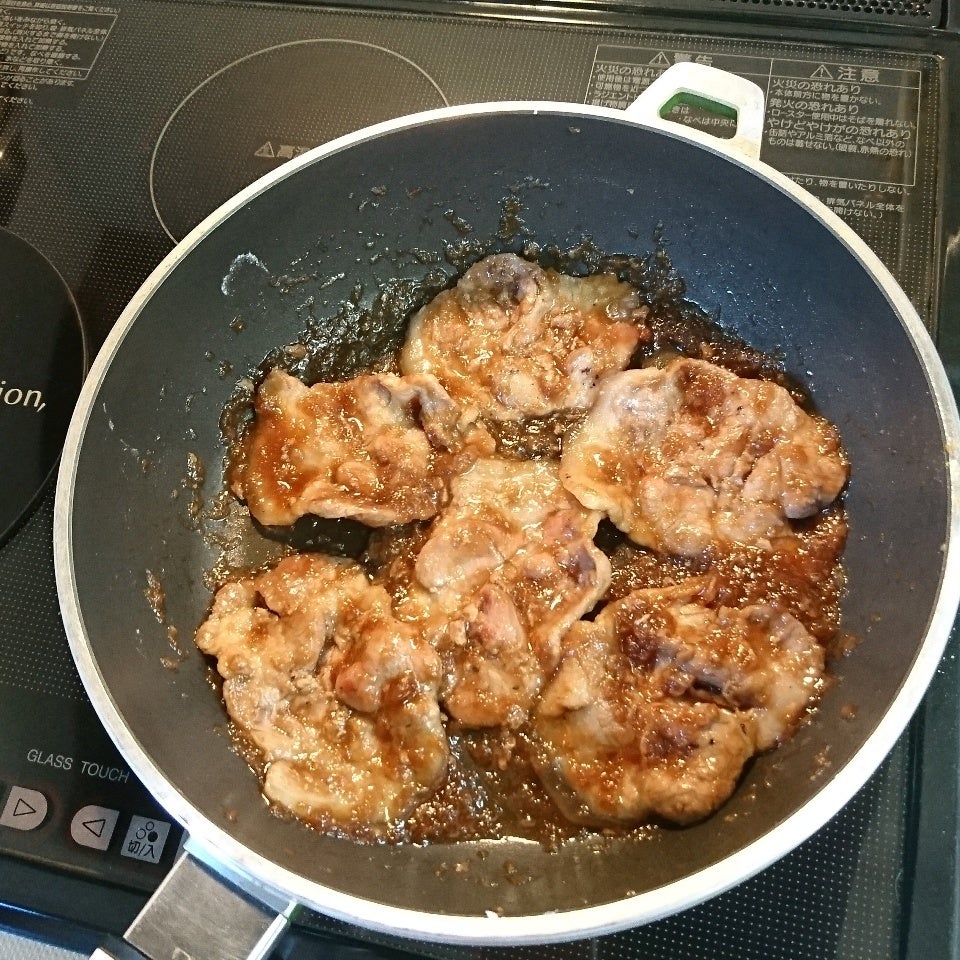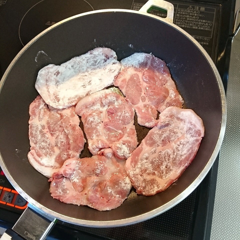 筋切りをした豚肉に小麦粉をまぶしサラダ油を熱したフライパンに入れて焼く