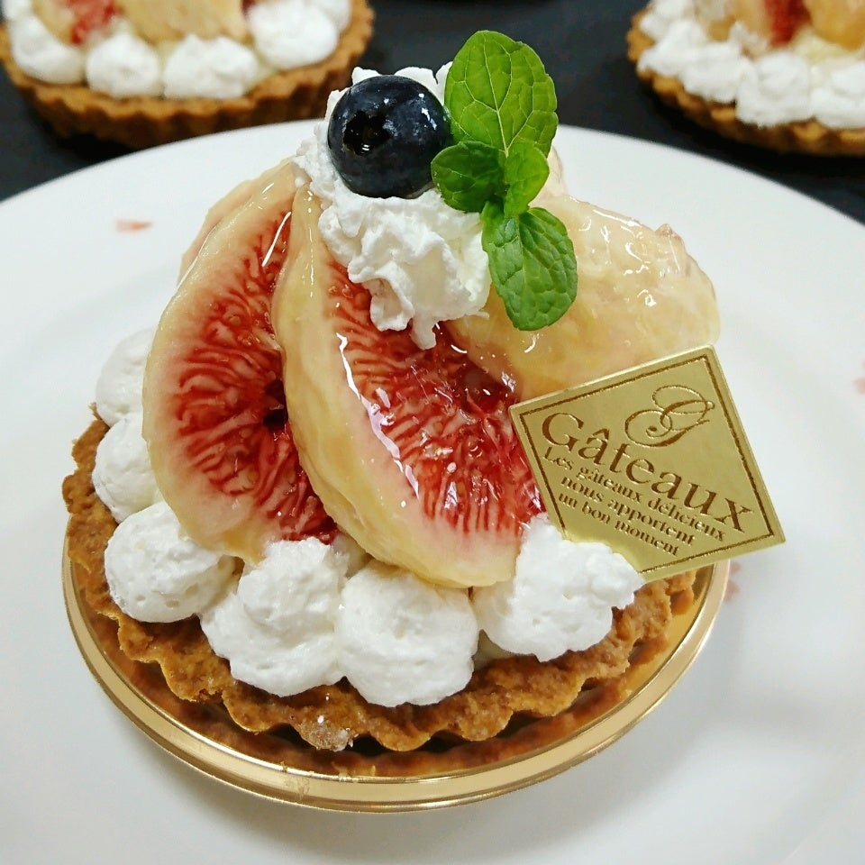 焼いて冷ましたタルト生地にカスタードクリーム、ホイップクリーム、いちじくを乗せ、上からナパージュを塗って出来上がり♪