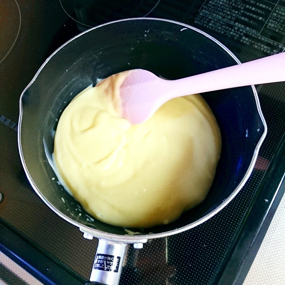 弱火にかけ、木べらでトロっとなるまで混ぜ、底に跡が残るようになったらバニラエッセンスを加えて混ぜて完成