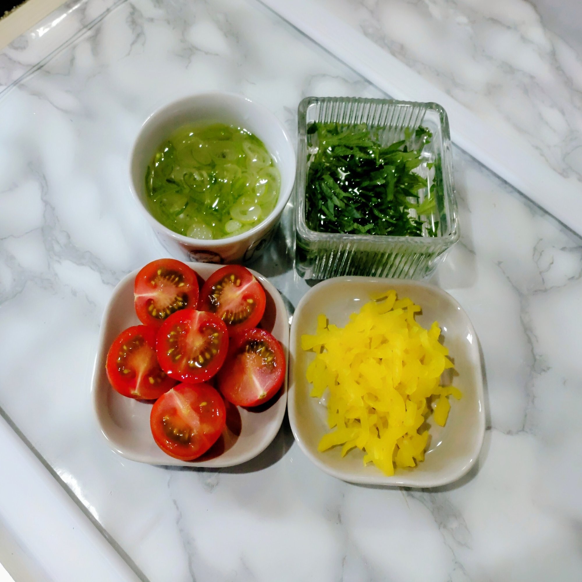 (大葉・ミニトマト・たくあん)ねぎ(左上)は柚子おろし用