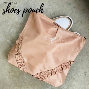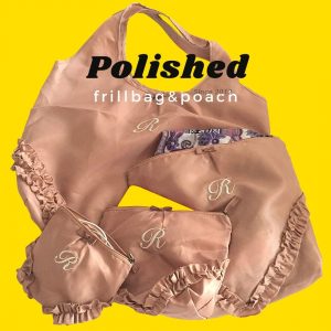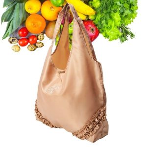 大人可愛いフリルがついたデザインで光沢感のあるナイロンを使い、お洗濯しても丈夫なエコバッグを開発。
