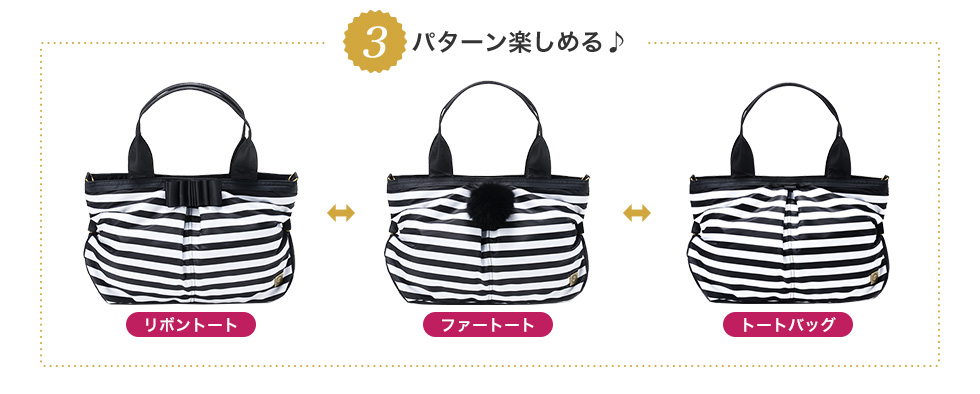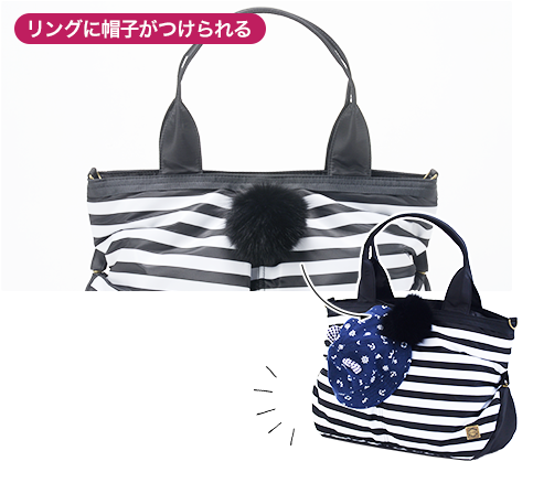 特にボーダーは、プライベートで着るカジュアルな服にもマッチし、かたくなりすぎません。もし、柄がカジュアルすぎると気になるようであれば、リボンの部分を取り外しファーをつけてもいいですし、何もつけずにシンプルに持ってもいいでしょう。