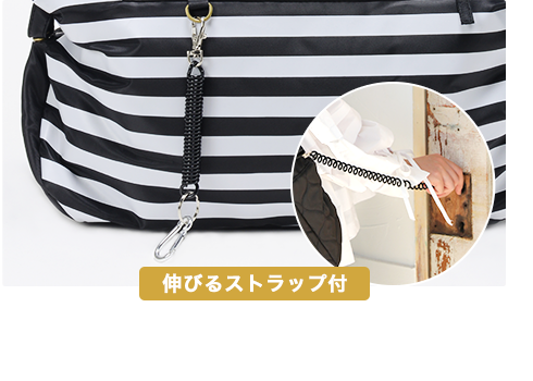 付属の伸びるストラップは、バッグと定期入れ、キーケースをつないでくれるので、ベビーカーや抱っこで手がふがっている時でも片手で出し入れができる仕様になっています。