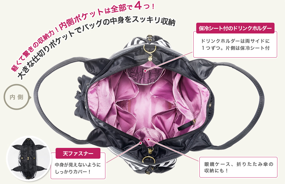 1つのバッグに子供と自分のものを入れて持ち運ぶため、ものがぐちゃぐちゃに混ざってしまいがちです。外出先で急いで汚れを拭きたいのに、ウェットティッシュが見つからないと焦ってしまいますよね。でもこのリボントートバッグは全部で仕切りが7個あり、中央には大きめの荷物を入れる事ができます。