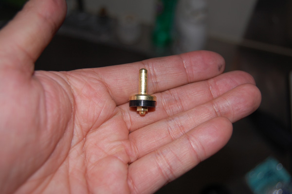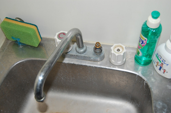 右側の蛇口のフタをとる。それで、見えてる真鋳ぽい部分をはずします。その下側にパッキンがこびりついてました。スパナでようやく分解。