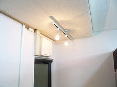 ライトアップ入口付近に壁ができたので、電球の関係上入ったときの明るさが低下しました。なのでスポットライトをつけてみた。まずは施工前。ドアの上の天井に丸いチョボがあります。(四角いのは主電源装置だから違います)その上です。で、そこにレールを設置してスポットライトを2つつけて出来上がり(笑)ヨドバシとコーナンで購入。しめて施工費は1万円以内。これでグーンとムーディですわ。