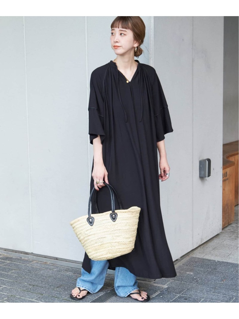リゾートぽい小物、キャップ、デニムシャツ、程よいワイドパンツ、ナップサックがきになる。