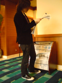 キャンペーン☆昨日から1stアルバム『MIND OF THE SUN』のキャンペーンが始まりました。これまた始めての体験♪パタパタ珍道中です(笑)1日目は昨日無事に終了☆★☆今日は2日目。さてさて、今日はどんな冒険が始まるのだろうか(笑)いってきま~す♪写メは休憩中のまっし一さん。違いもわからないクセに新聞を読んでわかるふり(笑)