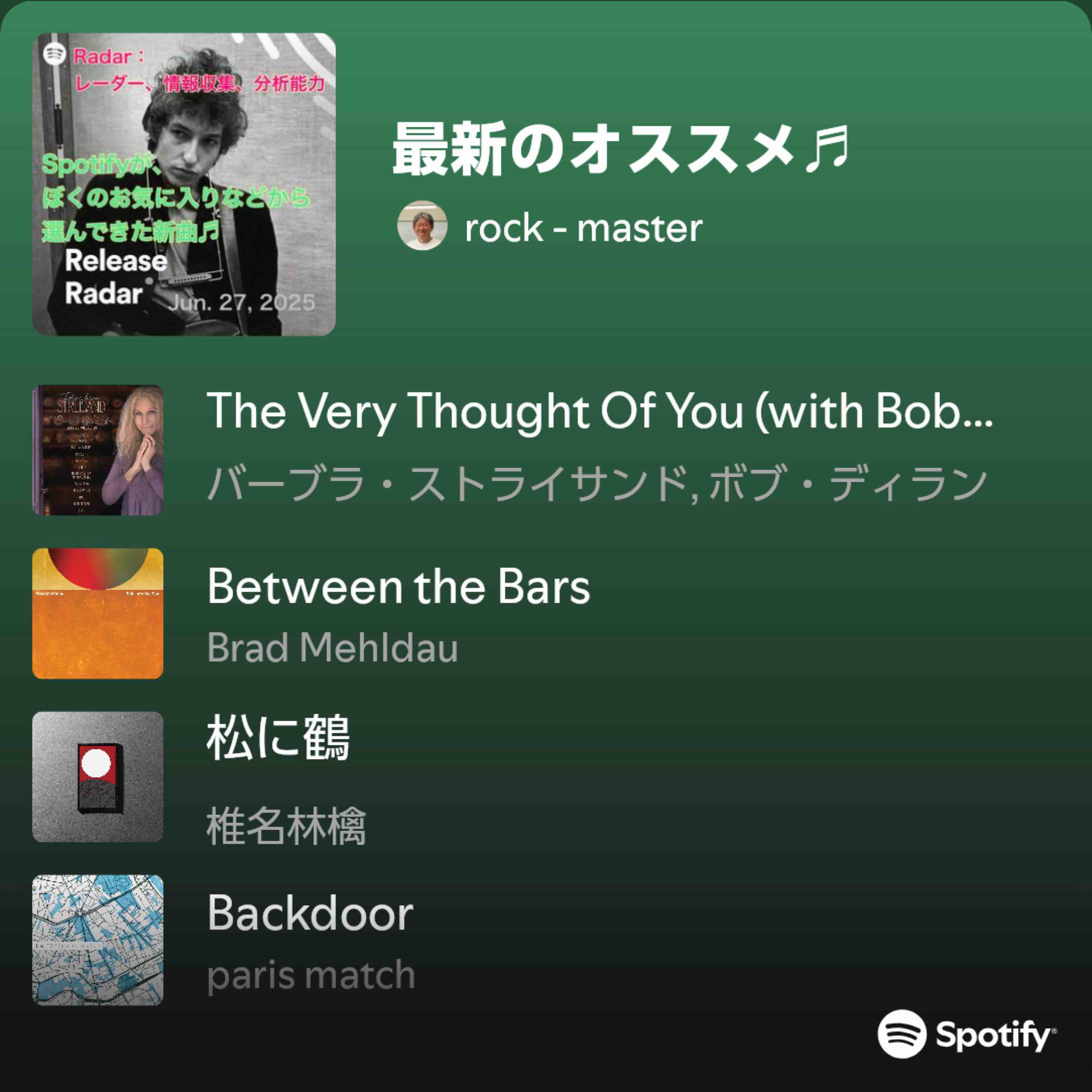 ぼくがフォローしているミュージシャンやお気に入りとSpotifyが判断した中から新曲のプレイリストが届いた。